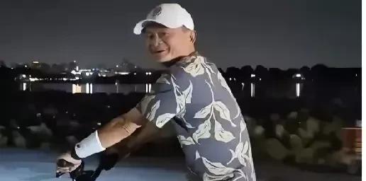 无官一身轻,阿里巴巴创始人马云骑自行车夜游西湖!61岁的马云头戴白色鸭舌帽,身穿