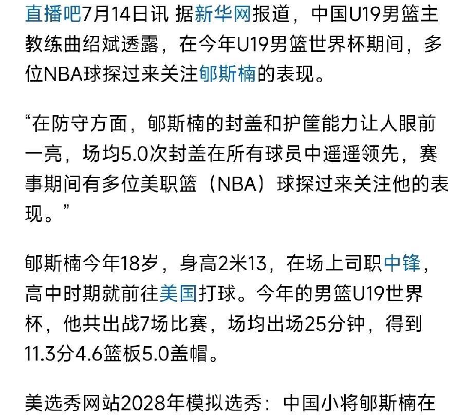 NBA球探又关注另一位中国中锋! 杨瀚森的成功,必定会引发连锁反应! 近日,有多名球探已经在关注中国球员郇斯楠,郇斯楠在今年U19的比赛中表现出色,场均能贡献11.3分4.6篮板5次盖帽,这盖帽数据着实恐怖! 也就是这一亮眼表现,让更多的NBA球探关注到了郇斯楠。 郇斯楠今年18岁,身高2.13米,也就再过两到三年的时候,郇斯楠就可以参加NBA选秀了,而根据最新的模拟选秀,郇斯楠会在28年首轮14顺位选中! 杨瀚森如果在NBA新赛季表现出色,会有越来越多的球探关注到中国球员,当然咱们球员自身的功夫还得硬!