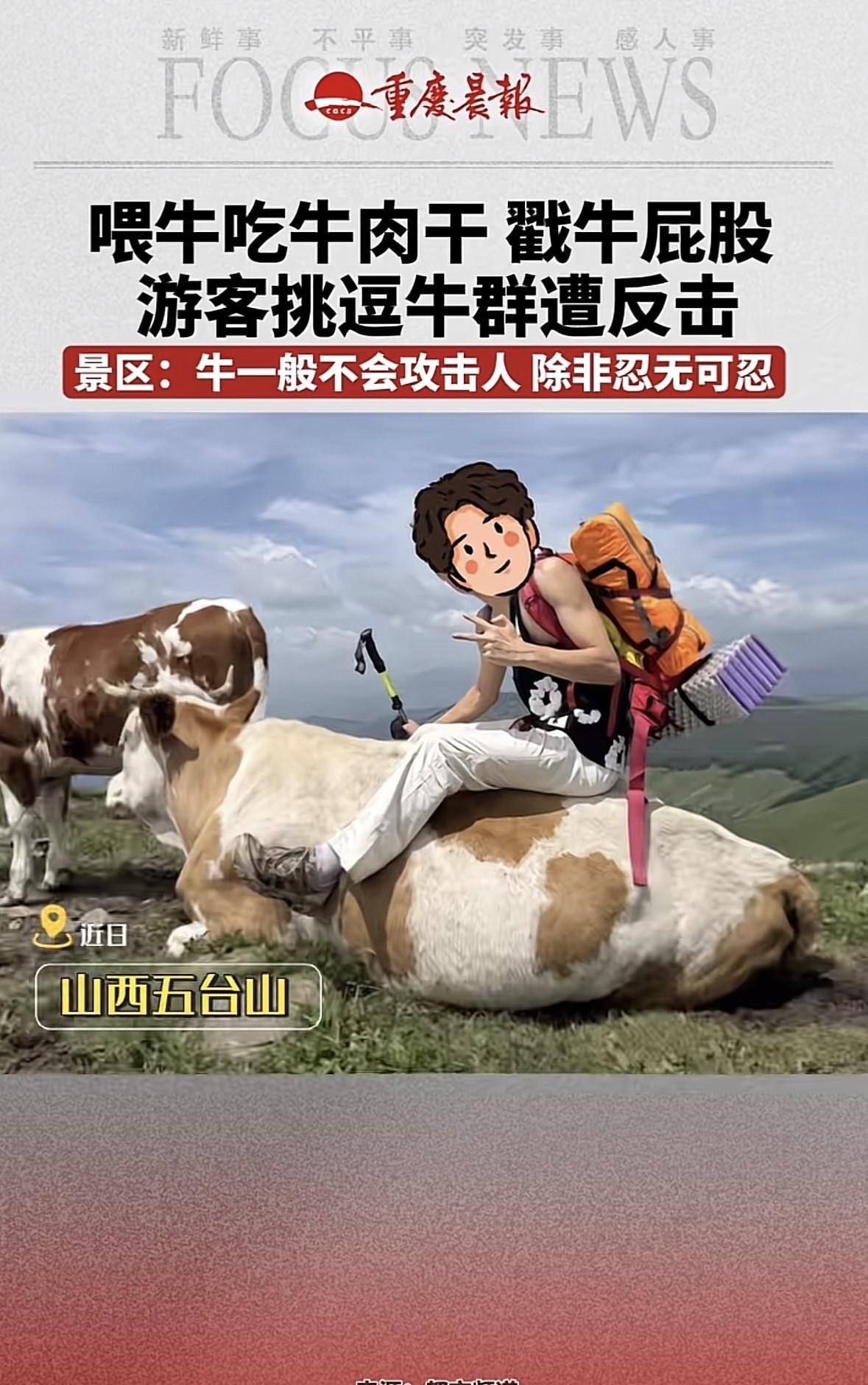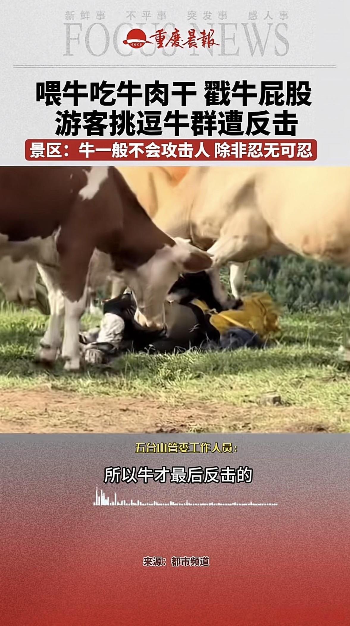 山西忻州,一男游客在景区游玩时,看见一群牛,他想恶 搞一下,就掏出一包牛肉干喂牛嘴里,还用登山杆不停戳打牛的屁 股,没想到,牛被男子的行为彻底激怒,一群牛围上来把他踩在脚下攻击他。工作人员回应,牛一般不攻击人,除非忍无可忍,这属于素养问题。网友:自作自受,不值得同情! 7月18号,重庆晨报报道,最近,网上流传着一段视频,说是五台山有游客被好几头牛给围攻踩踏了。 这消息一出来,可把不少打算去五台山游玩的人给吓住了,大家心里都纳闷,这好好的牛,咋就突然攻击人了呢? 17号那天,工作人员出来回应了这件事。 原来啊,这事儿还真不是牛无缘无故发疯。工作人员说,当时有游客干了两件特别不妥的事儿。 先是有游客拿牛肉干去喂牛。这牛肉干是啥?那可是牛的同类制成的食物啊。 你想想,牛平时吃草吃惯了,突然闻到自己同类的味道,得是个啥心情?代入一下,那不得吓一大跳,心里直发毛啊? 这牛闻到牛肉干的味道,估计也犯懵,不知道这游客到底想干啥,情绪上肯定就有些不稳定了。 紧接着,还有游客干了一件更过分的事儿。 他们拿着登山杆,一直不停地敲打牛的屁 股,是它能随便让人敲打的地方吗? 牛本来好好地在山上待着,突然不是被喂牛肉干就是被敲打的,肯定觉得被冒犯了,心里那股子火噌地就上来了。 于是,牛彻底被惹恼,开始了反击,好几头牛一起朝着游客围了过去,有的还踩了上去。 事后,工作人员还提到,这些牛常年在山上待着,一般情况下是不会攻击人的。这次的事儿,完全就是游客事先挑 逗在先,属于个人道德素养的问题。 有人说,昨天看了别人发的完整一些的视频,至少2人去惹牛,一个穿短裤的,一个长裤,拿登山杆多次打牛屁 股,强行坐在牛身上,把牛肉干塞牛嘴里,行为挺恶劣的,牛忍无可忍了,才攻击他的。 牛是比较温顺的动物,能让牛主动攻击你的原因就是红色的衣服或者不正当的挑衅。 同时,牛也是有灵性的动物,做农村长大的人个个都知道,天天要它梨田都不造反,农民也对它好,割草,杂粮,天冷时要烧热水绐它喝,都把牛当家里一组员对待。 也有人说,牛是草食性动物,当有人递来牛肉干这种它可能陌生甚至不符合其饮食习惯的东西时,它可能会因为好奇、紧张等情绪而出现过激反应。 那么,从法律角度,该怎么看待游客的行为?景区是否需要对这件事负责? 在这起事件中,游客存在拿牛肉干喂牛、用登山杆敲打牛屁股、强行坐在牛身上等恶劣行为。这些行为在法律上可能涉及对动物的不当侵害以及扰乱公共秩序等问题。 《治安管理处罚法》第23条规定:有下列行为之一的,处警告或者二百元以下罚款;情节较重的,处五日以上十日以下拘留,可以并处五百元以下罚款:扰乱车站、港口、码头、机场、商场、公园、展览馆或者其他公共场所秩序的; 五台山属于公共场所,游客的挑 逗行为引发牛的攻击,造成了现场秩序的混乱。 这种行为干扰了景区正常的游览秩序,影响了其他游客的安全和游览体验,符合扰乱公共场所秩序的情形。 虽然这个法条未直接提及对动物不当行为导致公共秩序混乱的情况,但游客行为产生的后果与扰乱公共场所秩序的特征相符。 如果情节较为严重,例如引发了大规模的恐慌或者造成了较为严重的后果,游客可能会受到警告、罚款甚至拘留的处罚。 《民法典》第1245条规定:饲养的动物造成他人损害的,动物饲养人或者管理人应当承担侵权责任;但是,能够证明损害是因被侵权人故意或者重大过失造成的,可以不承担或者减轻责任。 此条法律通常用于规范动物饲养人或管理人的责任,但在该事件中可从反面理解游客行为的过错。 游客故意挑 逗牛,存在重大过失,其自身行为是引发牛攻击进而可能导致自身损害的主要原因。 如果游客因牛的攻击而受伤,从法律责任分担角度看,游客自身的故意挑 逗行为会成为减轻或免除动物潜在“饲养人”责任的重要依据。 游客不能仅因自己受伤就要求景区或其他可能的管理方承担全部责任,自身的不当行为需要承担相应的法律后果。 对于景区是否需要对这件事负责,不能一概而论。 一般情况下,如果景区已经尽到了合理的安全保障义务,例如在危险区域设置了明显的警示标识、对游客进行了必要的安全提示等,景区可能不需要承担主要责任。 但如果景区对存在安全隐患的动物管理存在疏忽,比如没有对牛的活动范围进行有效管控,或者没有及时制止游客的危险行为,那么景区可能需要承担一定的补充责任。 不过从此次事件来看,主要是游客的故意挑 逗行为引发,若景区已尽到常规管理义务,其责任相对较小。 这件事儿也提醒大家,去外面游玩的时候,一定要提升自己的道德素养,尊重动物,不要随意去逗它们。 动物也有自己的情绪和底线,咱们不能因为一时的好玩,就做出一些不恰当的行为。不然,最后吃亏的还是自己。 对于这起事件,你有什么看法?