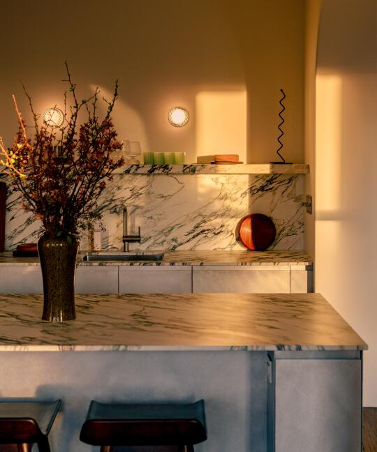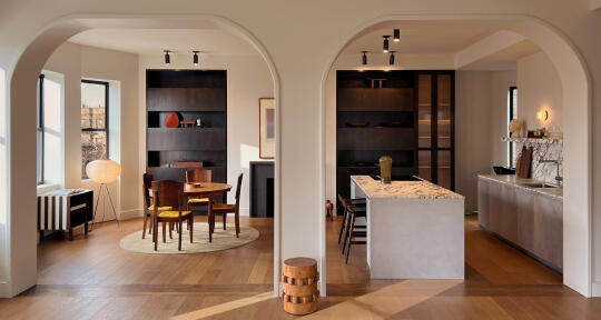 谁懂啊!被双拱形门洞戳中审美点~把空间划分得松弛又有层次,动线超流畅,视觉上还自带复古滤镜,走路都像在逛艺术展! 🌿材质混搭太绝了 暖调木地板+深棕柜体打底,温柔又显贵气;大理石岛台/背景墙冷冽又高级,中和得恰到好处~阳光洒进来时,木色和石纹的光泽感能美到失语! 💡灯光氛围拿捏了 轨道灯+复古壁灯双管齐下,白天靠自然光透门洞“画画”,黄昏开暖光,整个家像被裹进焦糖色里,氛围感直接焊在墙上! 🪑家具选品好会搭 中古餐椅的温润木质感,撞上极简岛台的利落线条,再丢个编织小凳当彩蛋~复古和现代在这儿玩起“跷跷板”,每处角落都藏着小心机! 连花瓶里的花枝、墙上的抽象画都在说故事,住这种家,日子能不浪漫吗?!