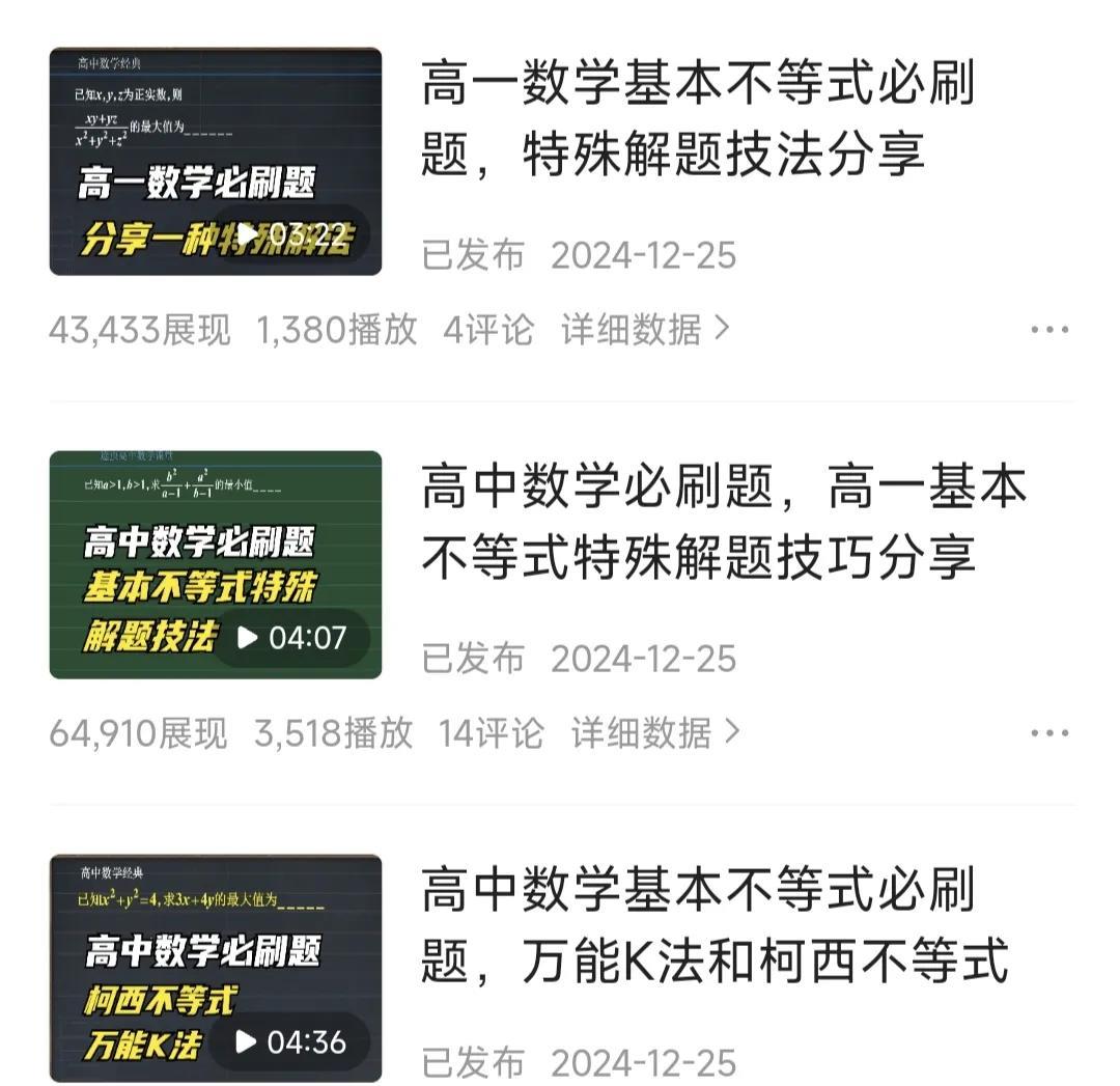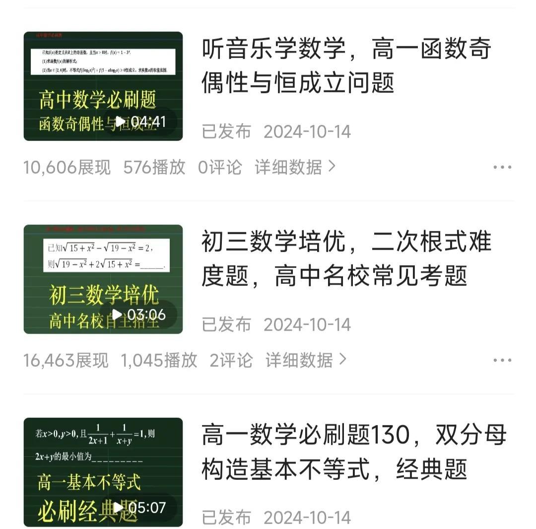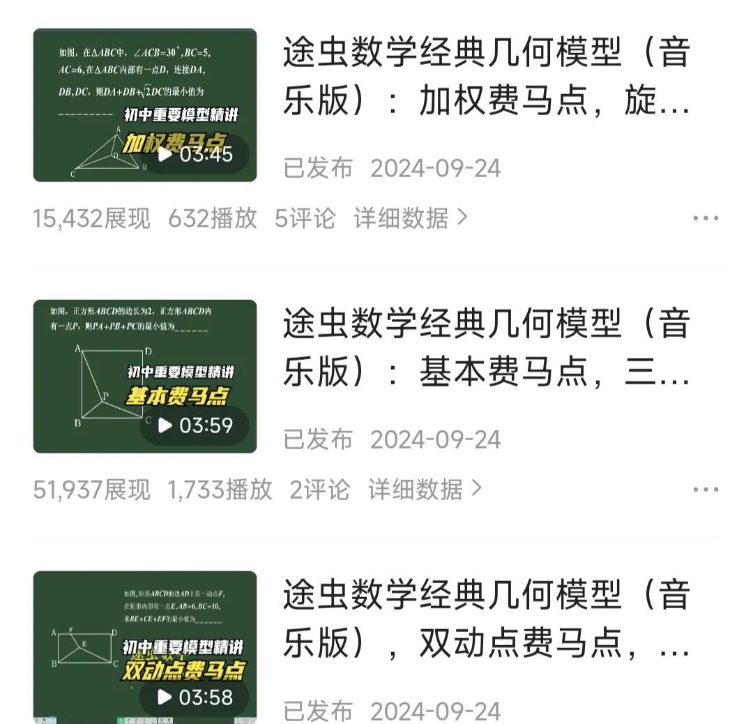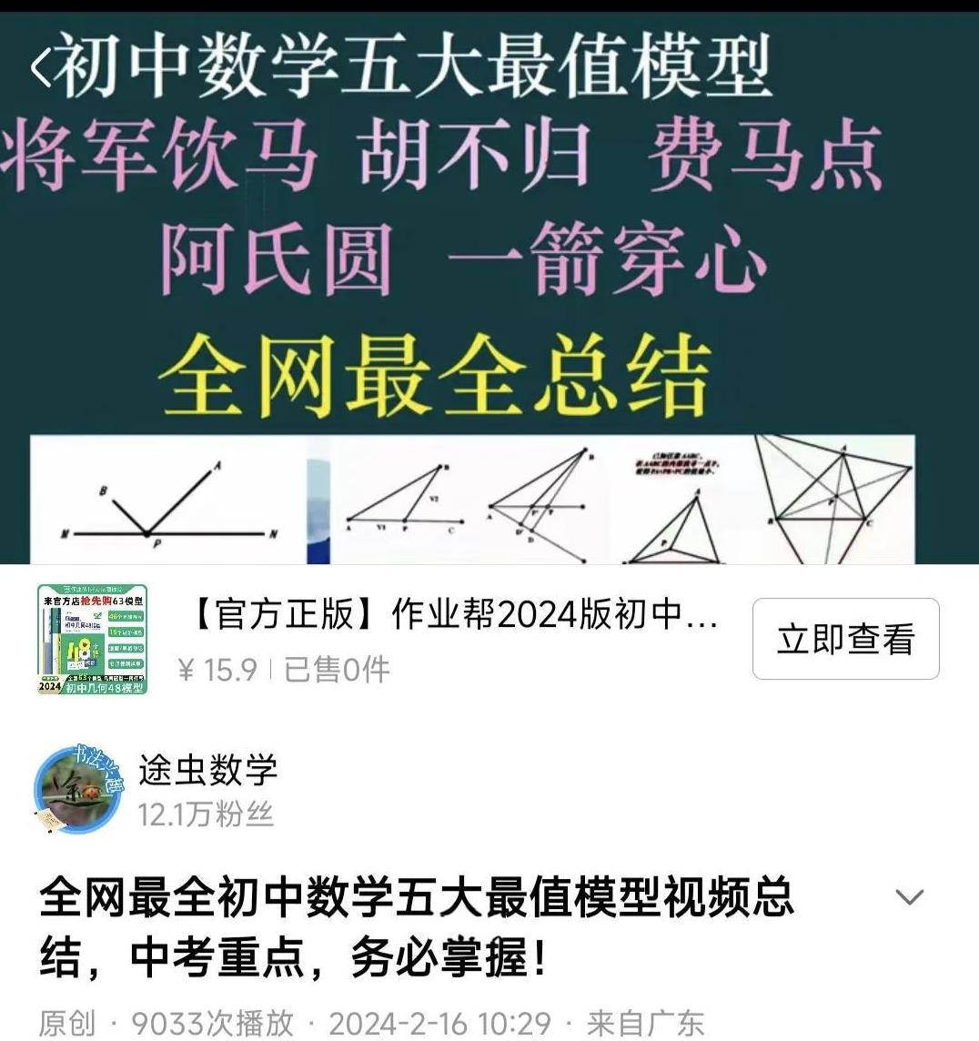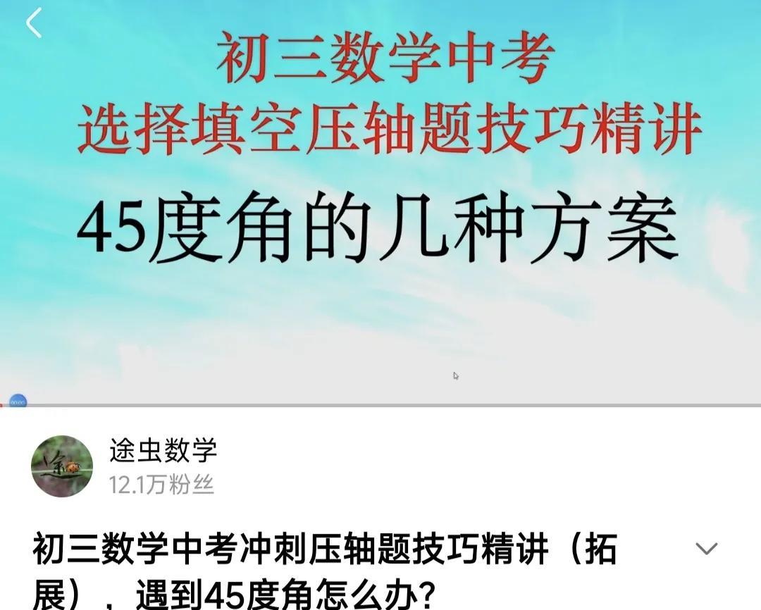 那我为什么还一直坚持录解题视频呢?有三个原因。第一是粉丝群体的期望,12万粉丝群体中有些粉丝还是希望我继续录解题视频,如果长时间没有录制,他们还会提醒我,也就是说,我的解题视频对有些孩子还是有用的。第二是自己通过录制视频,留存一些经典题目经典方法,这就相当于自己教学过程当中的一个笔记本,可以保存资料,有些时候也可以直接调出来给学生看。第三,录制解题视频,就像很多人每天习惯抽烟喝酒一样,感觉已经成为一种习惯。遇到有好题的时候,就想录制下来,其实也花不了多长时间。有什么好处呢,可以防止自己提前老年痴呆,[捂脸][捂脸]因为视频讲解总终究是要动脑筋的。 目前我录制的数学视频主要包括初中数学基本数学模型专题,综合压轴题技巧专题,选择填空压轴题技巧专题,高中名校自主招生专题,还有一部分是高中数学和小学数学。有兴趣的可以看我的视频专辑。#教育# #数学# #数学学习技巧# #数学解题技巧# 万唯中考母题解法2025解题方法思维大全提分技法必背知识精选新书