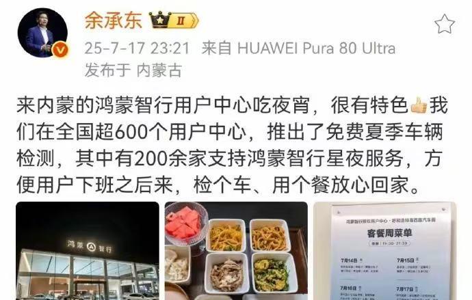 余承东的网速是真快!鸿蒙智行“酒店”被一博主带火以后,自己也去内蒙体验了一波夜宵