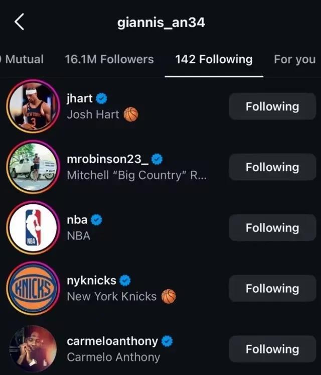 还是要走?还是去纽约?字母又有新动作! 今日美国网友爆料,字母哥社交媒体最新关注