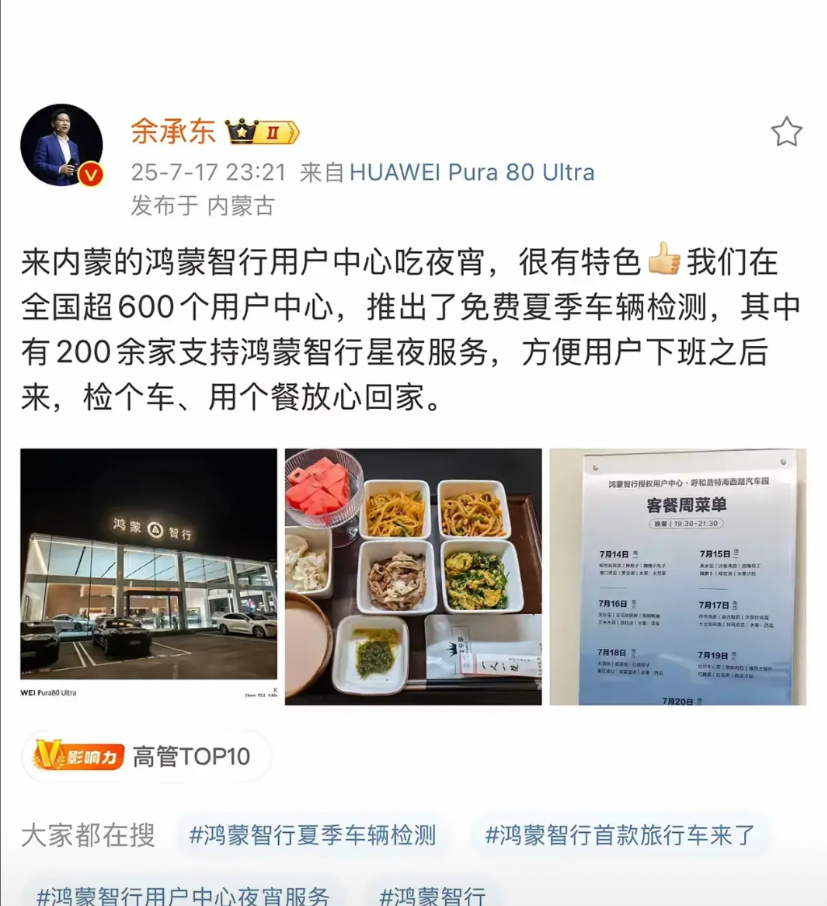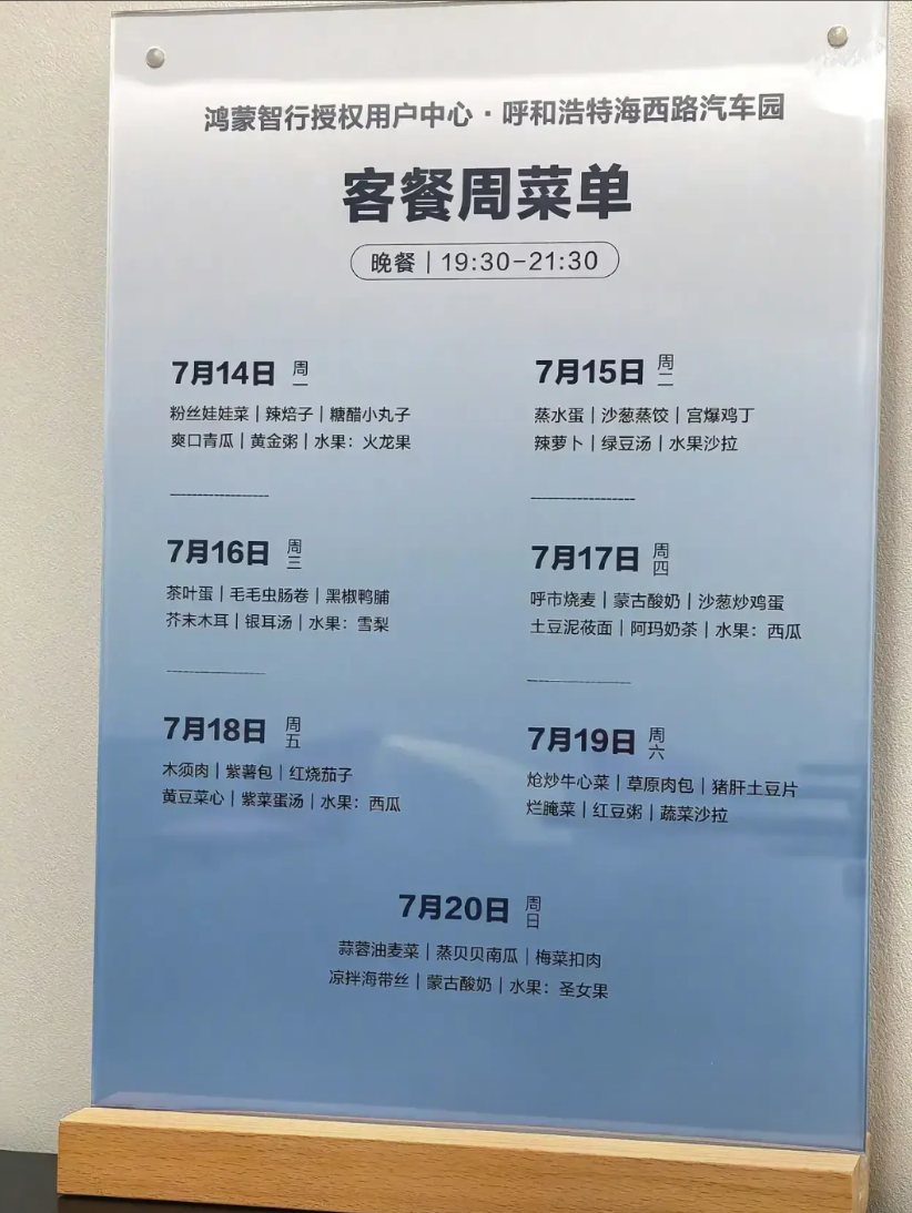 余承东又要笑得合不拢嘴了! 本来鸿蒙智行用户餐厅就是给用户吃个饭,检个车,想不到现在却火爆到堪比网红餐厅。 用户可以免费充电、洗车、吃饭一条龙,高峰期得排队等位,每周菜单都提前公布。 汽车行业“卷服务”的天花板应该就是鸿蒙智行的餐厅了吧? 有些宜家餐厅的感觉,五个菜加水果,量管够,吃得健康,买了鸿蒙智行的车,还能让你常回来坐坐的理由就是每天都不重样的特色菜啊! 余承东这波广告打得让其他车企只能去请米其林厨师才能超越了。