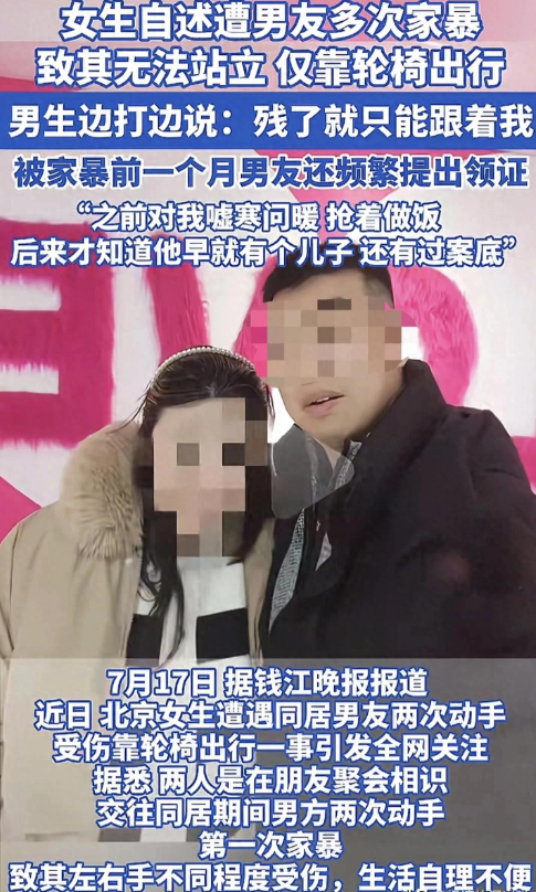 女生自述遭男友多次家暴,要靠轮椅出行,男友:残了就只能跟着我