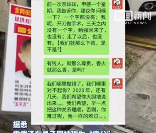 太窒息了!长沙,男子寻子22年,意外发现儿子被亿万富翁收养,从小没吃过一点苦。认亲10个月后,男子被儿子拉黑,断绝联系,男子晒出聊天记录哭诉,这10个月来,他尽力培养感情,却被儿子认为“窒息”! 长沙有个叫雷公的大叔,找了儿子川川整整22年。没想到,有一天他意外发现,川川被一个亿万富翁收养了,过得挺好,从没吃过啥苦头。本来吧,父子重逢该是个皆大欢喜的事儿,可奇怪的是,他们相认才十个月,关系就彻底闹僵了。 这十个月里,雷公总想弥补这些年错过的时光,天天给儿子发信息,诉说着思念。可奇怪的是,他说话总是特别小心,还带着点儿想控制儿子的意思,总是用“您”来称呼川川,好像在说:“我们找了你这么久,你得多感激我们,得回到我们身边才行。”但对川川来说,他一直生活在有钱人家里,亲情稳定得很,突然冒出来一个自称是他爸的人,这让他觉得压力很大,心里头并不觉得暖和。 一开始,网友们都挺同情雷公的,可看了他们的聊天记录后,态度都变了,觉得雷公对儿子的感情有点儿像绑架。咱们这些看热闹的都觉得憋得慌,更别说川川自己了。他也不是不要亲情,就是受不了这种老想从他这儿要点儿啥的关系。现在,川川把雷公给拉黑了,俩人不再来往。雷公只能对着那个冷冰冰的聊天框,自己抹眼泪。这拖了22年才认亲的父子情,最终还是没能打败时间和身份的差异。