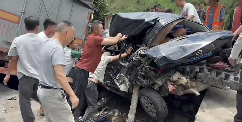 惨烈!大货车失控连撞七八辆车,两辆小车被压在货箱下惨不忍睹!7月18日13时31分云南临沧云县(羊头岩)祥林公路,发生严重交通事故致多人伤亡。 对向车道行车记录仪拍下车祸瞬间。 事故路段有施工队在施工,由于占道施工,双车道被占了一条道,只有一条可通行,所以只能轮流通过。一排车在停车等待通过期间,灾难发生了。一辆大货车从后方径直驶来,毫无减速的迹象冲向等待的车辆,连撞多车后斜倒在水沟里。 大货车疑似下坡,失控冲入车群。 两辆车被压在大货车车厢下,其中一辆黑色小车被压在尾部,车身全部扭曲变形,车里有孩子撕心裂肺的哭声,众人纷纷扒车救人。 另一辆是小厢式货车,整辆车直接被大货车压扁了,车里的人也被压在车里,从另一面看到一个人被压在座位上,另一个只看到一双鞋底。另外还有一个人躺在水沟里一动不动,两只鞋子都掉了,不知生死!看到这惨烈的场面,眼泪都出来了。 其它车辆不同程度受损,现场汽车零件碎了一地。