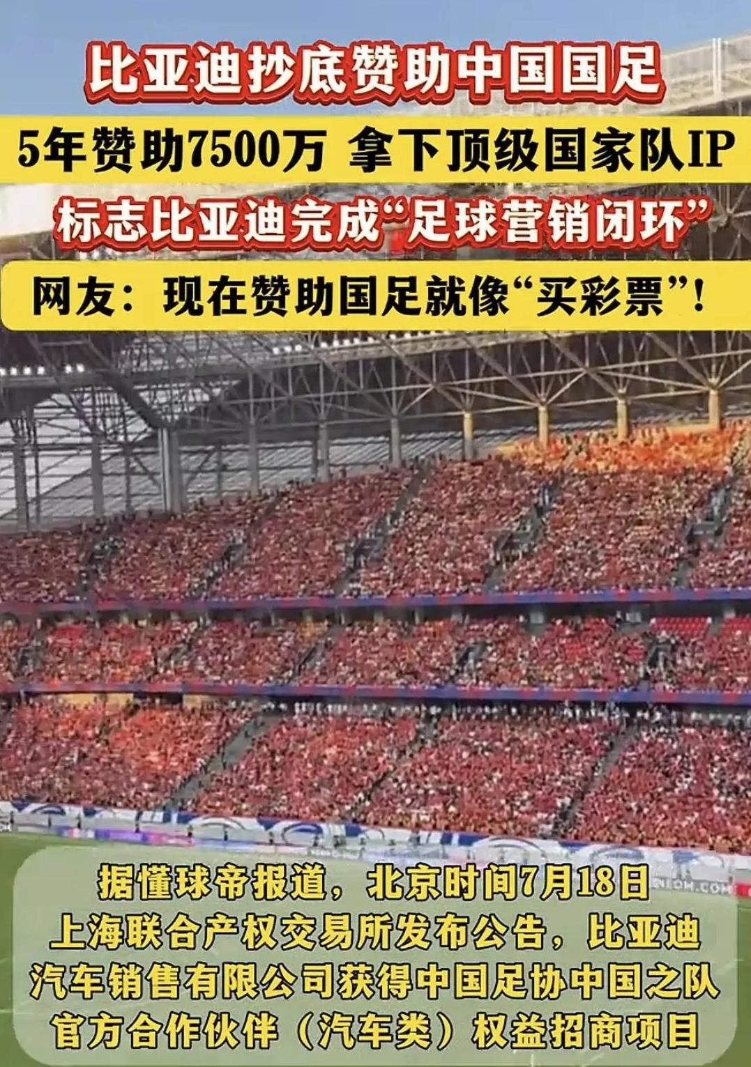 昨天国足再获金主的支持,比亚迪公司以7500万元的价格赞助国足五年。网友瞬间不淡