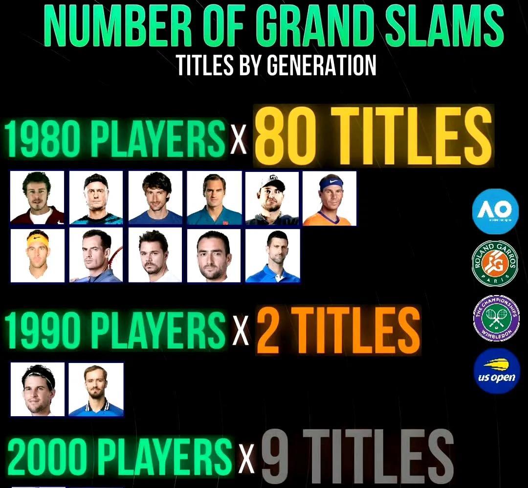 绝代双娇都没人看了?这不是网球的未来吗? 图一:最近三年BBC+ESPN的温网男单决赛收视率:2025年最低,2023最高。 图二:80后、90后、00后获得大满贯数。