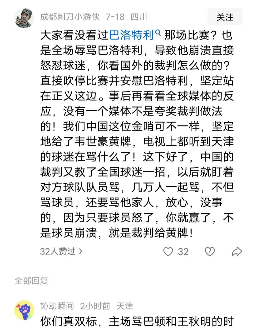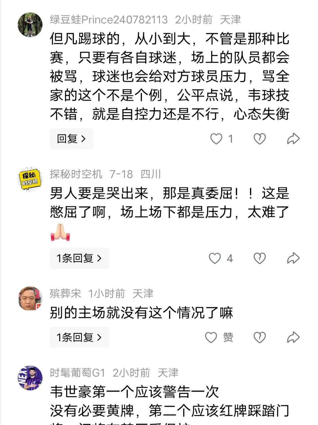 骂对方球员,骂对方球员的老婆,骂对方球员的老妈,请问,下一场是不是要骂对方球员的祖宗和孩子了? 不只是一个人在骂,是看台一大片区域的人在骂,是此起彼伏、整齐划一、没完没了的骂,像彩排过一样。 口头骂、坐着骂还不过瘾,还站得高高的骂,还举着高音喇叭骂,还手舞足蹈的骂,这比撒泼打滚还丑陋。 提倡文明观赛几十年了,骂声却从未停止过,因为,他们知道,骂得再怎么狠、再怎么凶、再怎么没素质也不需要付出任何代价。 在中国足球序列,韦世豪至少算得上是一名具有一定实力的优秀球员,我理解他的眼泪与愤怒。 但我不能理解的是,面对全场歇斯底里、无下限、无底线的谩骂,当值裁判的无动于衷,当值安保的熟视无睹,甚至主场负责人没有一丝丝要制止的意思。 直到此时此刻,中国足协还没有任何表态,可以这样说,长期以来中超的不文明观赛现象已经愈演愈烈,中国足协的包容、甚至放任有推波助澜之嫌,这是典型的不作为。 没什么好说的了,给予取消哪怕一个主场的小惩,对他们应该也是教训,至少也可以让球迷们看到中国足协是在做事的。 任何恶劣的行径必须要有人买单,这是国际足球的通用规则,我们需要与国际接轨,而不是成天关窗闭门的自娱自乐!