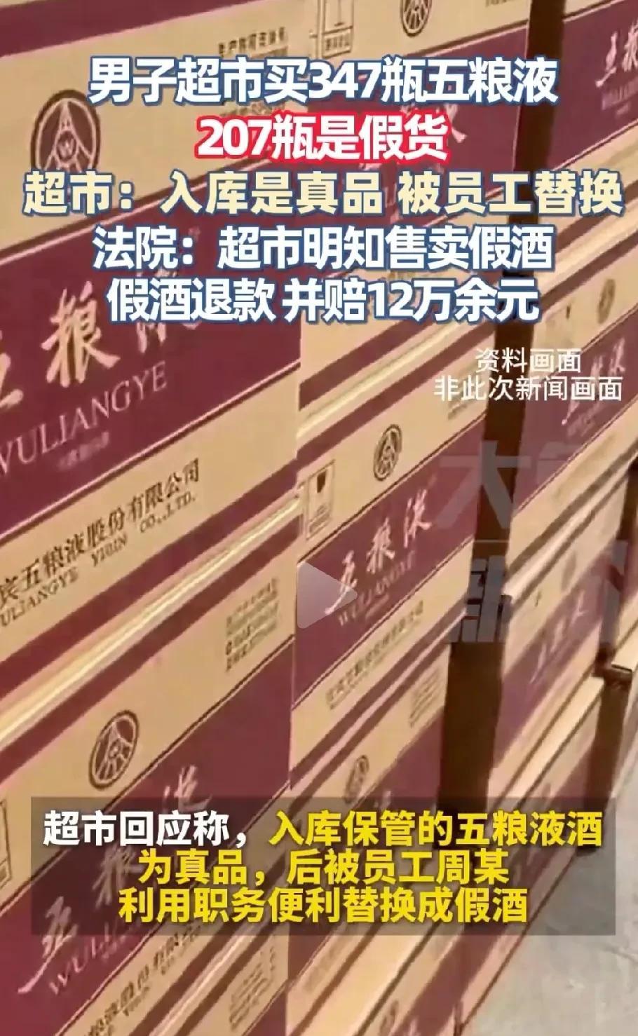 辽宁大连,男子以每瓶上千元的价格,在某超市购买347瓶五粮液,事后发现其中有部分属于假酒。男子向市监局投诉,经过鉴定,其中有207瓶是假酒。超市赶紧把责任推卸给员工,表示入库的酒都是真品,这是被员工给偷换成假酒了。本以为能逃过一劫,法院审理后,竟然这样判! 7月18日,红星新闻报道了一则超市销售假酒的案例,法院的判决完全出乎意料。 男子李先生有个买酒的习惯,相较于货币资产,李先生更看好白酒,这样的硬通货不仅能保值,遇上行情好的时候,靠增值大赚一笔也是可以的。 2024年1月2日,李先生在某大型超市购买了几瓶五粮液,每瓶价格1038元,他觉得这酒不错,有利可图,于是多次进行购买。 20多天的时间里,李先生累计在该超市购买了347瓶五粮液。 一下买这么多,也没地方存放,李先生就把酒寄存到一家烟酒店转售,他也能赚取一定的差价。 可谁知,没过多久,烟酒店老板提醒李先生,他的这批五粮液酒疑似有假酒,卖出去可是有风险的。 李先生有点不敢相信,超市的酒还能出现假酒吗?会不会是烟酒店老板搞错了? 怀着半信半疑的态度,李先生向市监局投诉。经过简单的调查,市监局发现这批假酒价值太高,数量太大,于是把案件移送给公安机关。 公安机关委托五粮液集团对这批酒进行鉴定,逐一排查后,确认这批酒里面,一共有207瓶假酒。 这可不是小数目,207瓶假酒,至少也是20多万的损失,这要是被市监局责令退一赔三,再处以一定的罚款,那后果不堪设想。 于是,超市赶紧把责任推卸给员工,表示这批五粮液入库的时候都是真品,是保管员周某利用职务便利,把一些五粮液换成假酒。 超市的意思很明确,这事和他们无关,也不是欺诈消费者,都是员工周某诈骗导致的,要追责也是找周某赔偿。 但这都是超市的一面之词,并没有足够的证据来证明这一说法。 对于此事,法院会如何审理呢? 一、超市构成消费欺诈,李先生可主张“退一赔三”。 《消费者权益保护法》第55条规定:经营者提供商品或者服务有欺诈行为的,应当按照消费者的要求增加赔偿其受到的损失,增加赔偿的金额为消费者购买商品的价款或者接受服务的费用的三倍。 超市作为经营者,销售假五粮液的行为直接构成欺诈。根据法律规定,超市都有义务按照假酒的金额,给李先生退款,并赔偿价款的3倍赔偿。 二、员工偷换假酒的行为属于职务行为,超市须对外担责。 《民法典》第1191条规定:用人单位的工作人员因执行工作任务造成他人损害的,由用人单位承担侵权责任。 保管员周某调包假酒的行为,是利用职务便利实施的,属于履行工作职责过程中的行为,即便超市主张周某个人犯罪,也不能免除其作为用人单位的法律责任。 207瓶假酒调包需长期操作,涉及验货、入库、存储等多个环节,而超市未提供进货凭证、质检记录,且监控、巡检制度形同虚设,属于重大管理漏洞。 超市以入库酒为真辩解,但未能举证合法来源,法院据此推定超市存在主观过错,不得以员工个人行为抗辩免责。 因此,超市可通过起诉员工周某追偿损失,但对外仍需向消费者承担全部赔偿责任。 三、法院推定超市明知售假,基于管理漏洞否定免责主张。 根据《最高人民法院关于审理食品安全民事纠纷案件适用法律若干问题的解释》第6条,销售者需举证证明已履行进货查验义务且不知情。 本案中,超市既未提供进货合法证明,亦无有效验货记录,法院直接推定其未尽基本注意义务,构成明知售假。 超市长期未发现207瓶假酒调包,暴露其库存管理完全失控,足以证明其主观上存在放任或重大过失。 超市的员工个人行为辩解被法院视为推卸责任的遮羞布,因其管理漏洞才是假酒流入市场的根本原因。 法院推定认为,超市对入库的五粮液酒没有查验,也没有合法货源,属于知假售假。 最终法院判决,超市对假酒进行退款,并赔偿李先生12万余元。