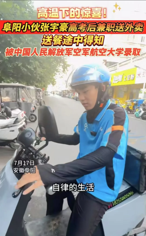 安徽,小伙高考后兼职去送外卖,送餐途中得知自己被中国人民解放军空军航空大学录取!网友:既然录取了,那么劝你辞掉外卖员工作,回家好好休息,好好锻炼身体。因为你的身体,在读大学前后,不能有负伤。外卖员风险太高!