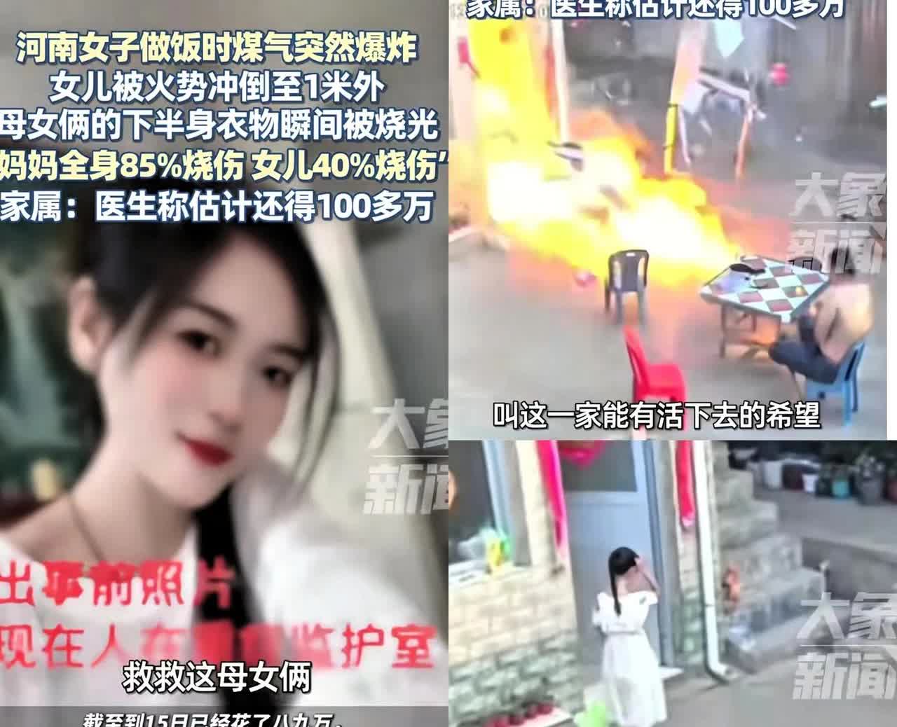 真的太痛心了! 河南一女子做饭时,煤气突然爆炸,7岁女儿被火势直接冲倒在1米之外,妈妈全身85%烧伤,女儿也有40%烧伤。一个原本幸福的家庭,瞬间被这场灾难打得支离破碎。 谁能想到,一顿普通的早饭时间,厨房竟变成了人间炼狱。这也给我们所有人敲响了警钟,平时一定要重视燃气安全,定期检查设备 ,千万别抱有侥幸心理。 目前母女俩的治疗费预计要100多万,对普通家庭来说,这是天文数字。希望大家能伸出援手,帮帮这对可怜的母女。要是你遇到这种事,你会怎么做呢?