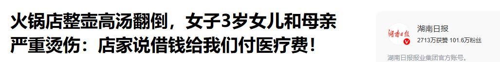 “看着都疼!”上海一家五口去吃火锅,叫服务员加汤。不料,壶嘴手柄突然断裂,整壶开水全部倒在了老人和3岁女童身上!孩子被烫的哇哇大哭,可服务员却跑了。整个火锅店竟没有一人上前帮助,甚至就站在一旁看戏。家属要求店家支付医疗费,却又遭到拒绝,说只能借! 7月19日报道,上海的陈女士在网上寻求媒体的救助,说自己前段前段时间带着家人去当地一家火锅店吃火锅,因为服务员工作不谨慎,让孩子和母亲两人住进医院,可火锅店对此的处理方式就是冷眼旁观。 事发在6月29日晚上,陈女士一家5口,去吃花胶鸡火锅,吃到一半的时候,陈女士让服务员来加点汤底。可是没有想到服务员拿着开水壶,刚进行倾倒的动作,壶把就断裂开来,整壶热水,在夹杂飞溅的火锅热油,全部倒在了陈女士的母亲和3岁的女儿身上。 事情发生之后,服务员只是将损坏的壶捡走,后来就再也不见了踪影。陈女士和丈夫一群人就赶紧帮老人和孩子降温,并拨打了急救电话。让陈女士生气的是,自己在救助孩子的时候,整个火锅店没有一人上前道歉,或者帮助。甚至有不少服务员就站在围观,或者是给其他桌子上菜。 陈女士觉得这个店铺缺少对突发情况的培训,但现在的当务之急就是给孩子和老人治病,陈女士并没有时间去计较这些。最终母亲被诊断8%的烫伤,女儿4%的烫伤,两人跟都是二度烫伤,还有部分是重二度深二度的烫伤。 住院之后,陈女士想着可能当天事发太突然,火锅店的老板不在,她觉得这件事情毕竟和火锅店有脱不了的干系。陈女士以为先不说赔不赔偿,但至少火锅店老板会带着服务员前来道歉,可是并没有,陈女士自掏腰包给家人看病已经花了2万多元的费用。 事发10天火锅店没有给任何的说法,后来陈女士主动维权,火锅店这才道了歉,不过并没有要报销医药费和赔偿的意思。还是在陈女士的要求下,火锅店说可以以借款的形式,借给陈女士一部分资金,让陈女士先带着家人看病。 这可让陈女士恼的不行,明明火锅店的服务员给他们造成的伤害,火锅店居然还敢说“借”?陈女士还怀疑,服务员当时急着收走热水壶,是不是就是因为是服务员自己没有扣好,所以急着消灭证据呢? 可是火锅店对此的态度非常冷淡,陈女士无奈之下只能寻求媒体的帮助。随着舆论的蔓延,火锅店才终于拿出了诚意,和陈女士真诚的道了歉,还承诺绝对会配合陈女士家人后续的治疗费用。不得不说这个火锅店实在太不专业了,也不够负责任。 对此,你怎么看呢?欢迎在下方评论~