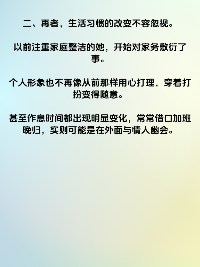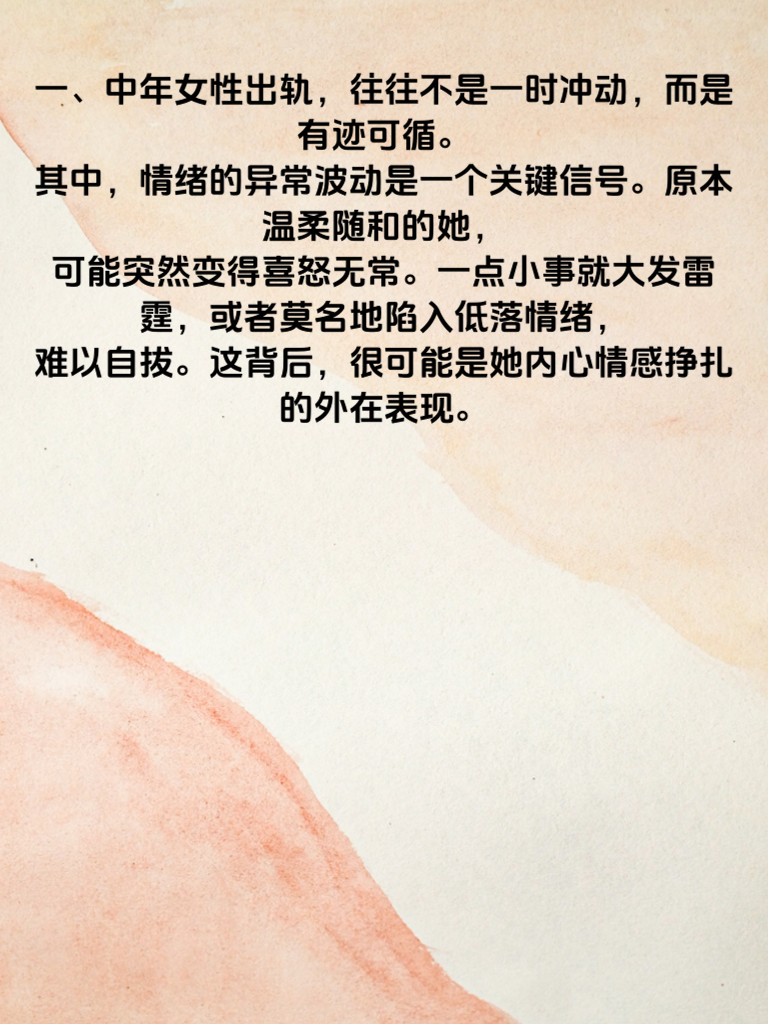 一、中年女性出轨,往往不是一时冲动,而是有迹可循。其中,情绪的异常波动是一个关键信号。原本温柔随和的她,可能突然变得喜怒无常。一点小事就大发雷霆,或者莫名地陷入低落情绪,难以自拔。这背后,很可能是她内心情感挣扎的外在表现。 二、再者,生活习惯的改变不容忽视。以前注重家庭整洁的她,开始对家务敷衍了事。个人形象也不再像从前那样用心打理,穿着打扮变得随意。甚至作息时间都出现明显变化,常常借口加班晚归,实则可能是在外面与情人幽会。 三、还有社交方面的迹象。她会频繁地接打神秘电话,每次通话都刻意避开家人。对手机信息格外敏感,总是背着人偷偷查看和回复。而且,开始热衷于参加各种聚会,结识新的异性朋友,社交圈子变得复杂起来。一旦发现中年女性出现这些迹象,一定要警惕,及时沟通,了解她内心的真实想法,防患于未然。