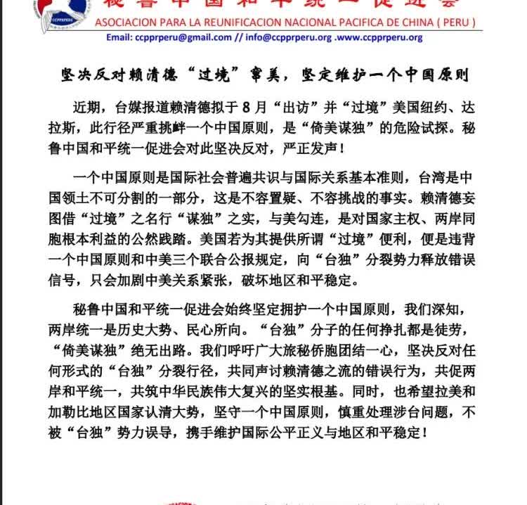 【秘鲁中国和平统一促进会就赖清德“过境”窜美发表严正声明】