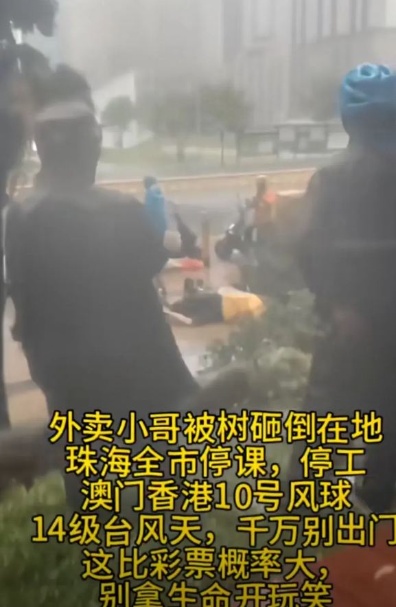 终于还是发生悲剧了,珠海这么大的台风天还要去送外卖,难道分不清赚钱和保命的重要性吗?今天上午就有见有外卖员来小区送外卖,当时就想不明白为什么这样做?现在就看到了外卖小哥被台风刮倒的树砸倒在地,还不知道怎么样了?旁边还有几个外卖小哥看样子也是在送外卖的,希望平台也能监管一下,不要让他们接单了~