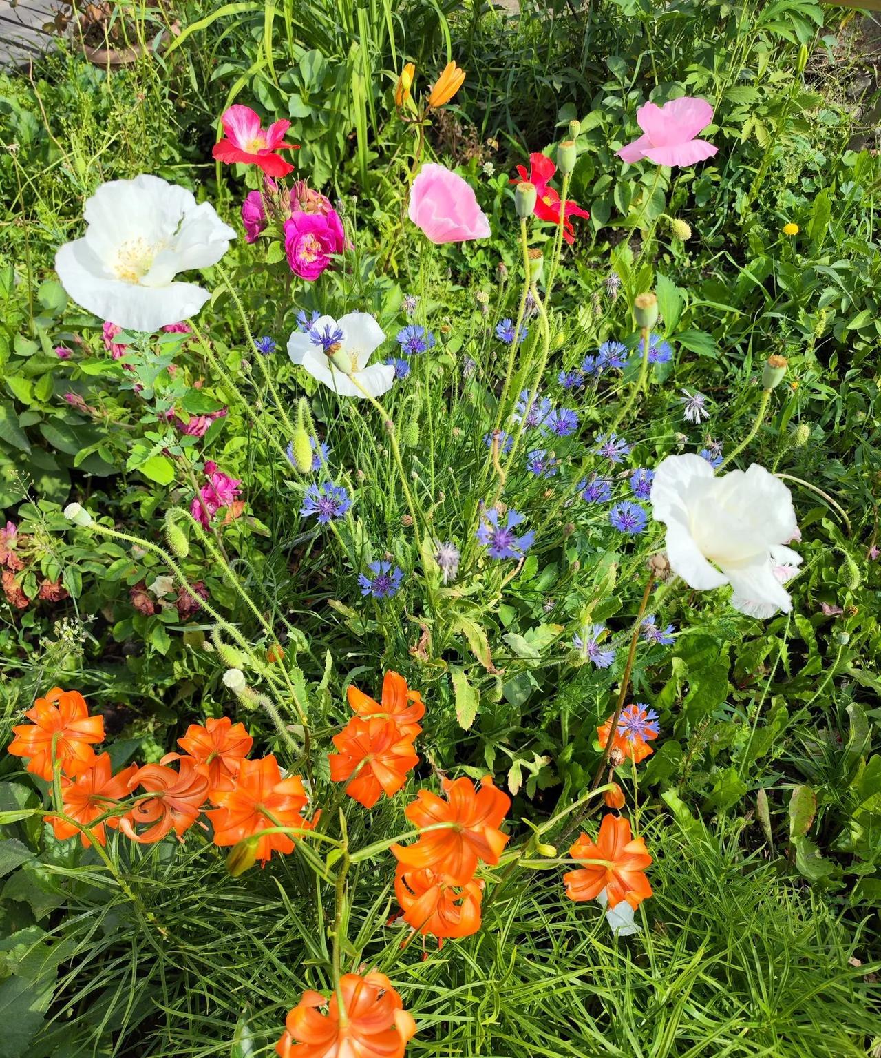禾木民宿的花朵好漂亮。不过饭挺贵。 禾木民宿村庄很大,几乎每个民宿都种的花花草草,很是吸引人。 我拍到了好几种颜色的百合,我们那里没有,不知道是不是国外的品种。 还有好多不知道名字的花花草草。 这边也有好多种向日葵的。 我们昨晚在村里吃的晚饭,拌面太筋道了,不好咬。肉串8元一个。同事不吃肉真是遭罪了,找不到可以吃的东西,只好去肯德基买薯条吃。 今天的早餐,一小碗牛奶10元一个玉米也10元。 同车的游客说,出门旅游,就是花钱遭罪。