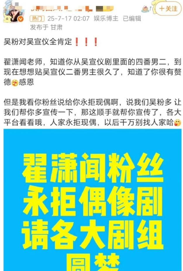 翟潇闻粉丝白闹了! 电视剧《有戏》官宣,领衔主演是吴宣仪和翟潇闻,而且是女主名字