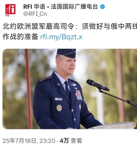 北约想打中国?7月18日,法国国际广播电台放出一条重磅消息:北约欧洲盟军最高司令格林克维奇抛下狠话,北约得为同时应对俄罗斯和中国、在欧洲和太平洋打“两线作战”做准备,还点名2027年可能是“爆发点”。 长期以来,北约的主要精力都集中在欧洲方向,尤其是俄乌冲突爆发之后,更是将资源优先投放到东翼防线,如今北约突然提及中国,并将印太区域纳入北约的备战范畴,无疑释放了新的信号。 北约不再满足于原有的区域性防御思维,而是开始把可能的双线冲突纳入整个战略设计。 格林克维奇提到2027年并不是随口一说,这个时间点在不少国家的战略评估中都反复被提及,从美方的公开情报判断到一些研究机构的报告,2027年一直被认为是中国具备较强能力处理台海问题的关键时间点。 北约的这种预判并不意味着冲突一定发生,但它成为各方提前布局的理由,北约不能等到那天真的到来才手忙脚乱,而是要从现在开始思考资源调度、部队部署、后勤体系、情报共享等方方面面的问题。 从格林克维奇的讲话中可以读出一个核心担忧:如果有朝一日中国在台海采取重大行动,很可能引发连锁反应,俄罗斯这边也不是坐视不动,他们与西方的对抗已经持续多年,一旦发现有可乘之机,极有可能趁机扩大对欧洲的军事施压。 这就意味着北约要面对的不再是局部冲突,而是东西两个方向同时发力的全面挑战。 从防务布局到军备生产,从情报协同到军演准备,北约现在正加速推动一系列调整,比如格林克维奇在会上明确提到,要增加防空系统的部署,提升弹药产能,减少对单一国家的依赖。 很多西方国家也在陆续调整军费预算,将更多资源投入到防务领域,这些变化表明北约对未来安全局势的担忧已不再是纸面讨论,而是进入了实际操作阶段。 过去看起来遥远的印太问题,正在逼近北约的地缘神经中枢,随着美日澳等国家与欧洲进一步加强协调,北约势必要回应这个变化,不再满足于只关注传统欧洲边界。 这种全球化的防务思维虽然对北约来说是转型的机会,但也是巨大的压力,要支持两个战区的运作,意味着资源分配将变得更加紧张,政治协调的难度也会进一步提升。 当然这类发言也有内部动员的作用,北约联盟可以督促北约成员国尽快提高军费支出,同时也能推动整个欧洲的防务产业链重启,在俄乌战争初期,很多欧洲国家的弹药储备其实非常有限,补给速度远跟不上消耗速度。 这次北约借着“同时对抗中俄”的提法,也可以看作是给军工体系打了一针强心剂。 不论是美国军方,还是欧洲主要国家的防长、外长,他们都在强调应对中俄双线挑战的紧迫性,这说明这种判断不是个人观点,而是多方共识正在形成,这背后或许还有更深层的逻辑,那就是对现有秩序稳定性的担忧正在加剧。 无论是俄乌冲突的僵局,还是台海问题的走向,都可能成为打破现有平衡的导火索,而北约需要做的就是在动荡真正来临之前构建起足够的战略缓冲。 没有哪个国家真心希望打仗,也没有哪个联盟愿意承受战争带来的后果,但问题在于如果潜在冲突正在逐步显现,战略准备就不能停留在纸面,如果不想打败仗,就要先准备打仗,北约现在所做的,就是尽量让这种准备在和平时期完成,而不是在战火中临时抱佛脚。