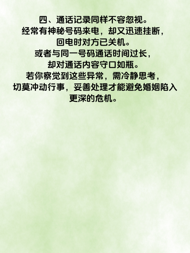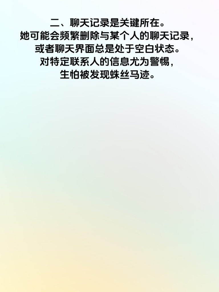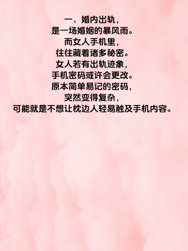 一、婚内出轨,是一场婚姻的暴风雨。而女人手机里,往往藏着诸多秘密。女人若有出轨迹象,手机密码或许会更改。原本简单易记的密码,突然变得复杂,可能就是不想让枕边人轻易触及手机内容。 二、聊天记录是关键所在。她可能会频繁删除与某个人的聊天记录,或者聊天界面总是处于空白状态。对特定联系人的信息尤为警惕,生怕被发现蛛丝马迹。 三、社交软件的动态也暗藏玄机。朋友圈可能设置了分组,某些动态只有特定人可见。发布内容或许变得小心翼翼,不再像以往那般随意分享生活点滴。 四、通话记录同样不容忽视。经常有神秘号码来电,却又迅速挂断,回电时对方已关机。或者与同一号码通话时间过长,却对通话内容守口如瓶。若你察觉到这些异常,需冷静思考,切莫冲动行事,妥善处理才能避免婚姻陷入更深的危机。