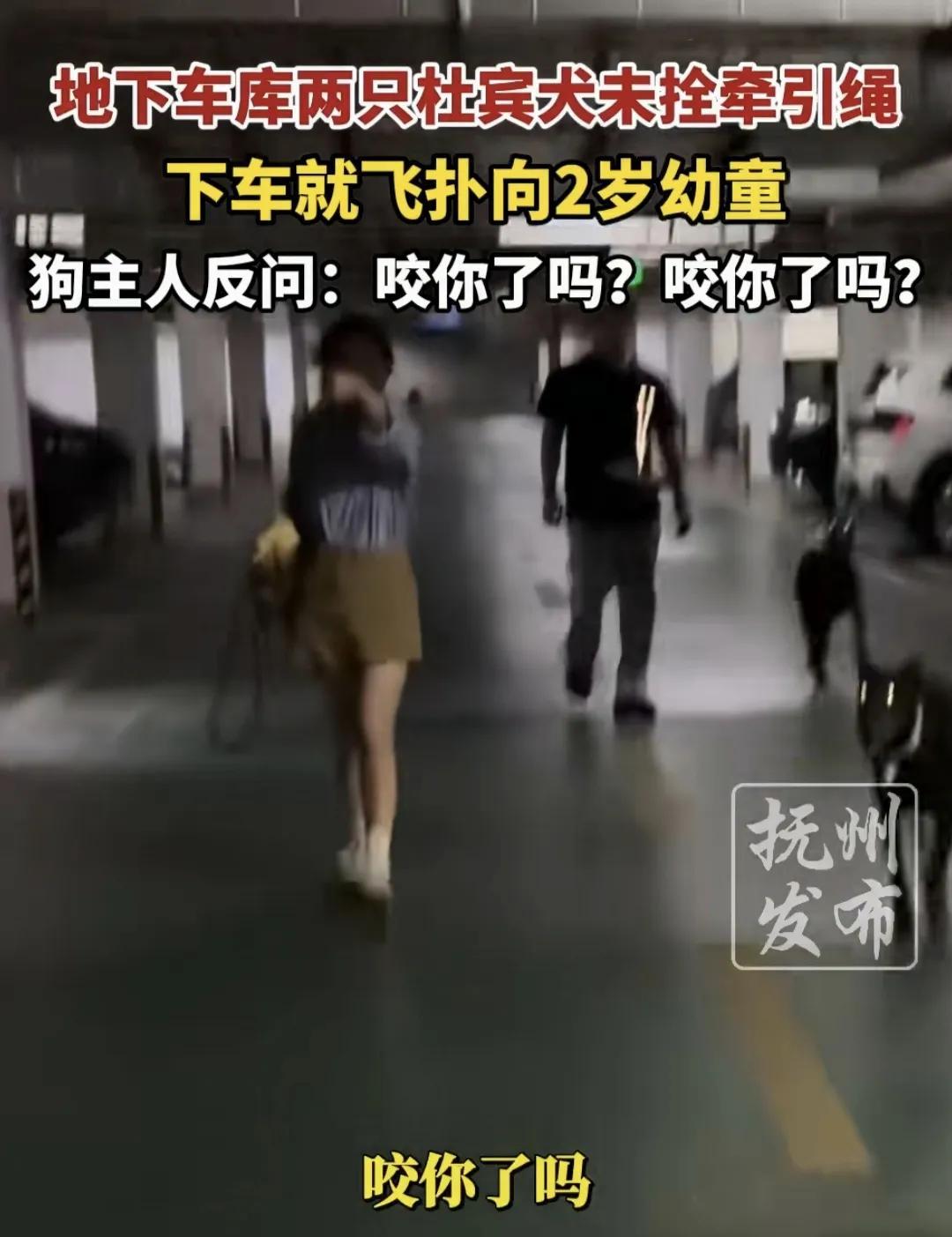 地下车库,两条杜宾犬从车里钻出来之后,飞扑两岁幼童,幼童父亲怒,声称遛狗不拴绳,