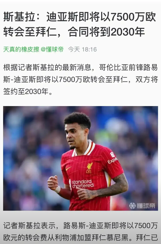 外媒都在报道迪亚斯7500万欧元去拜仁。