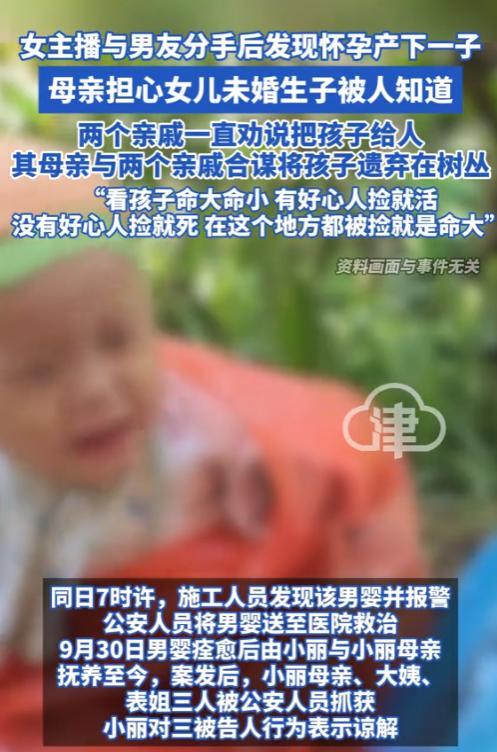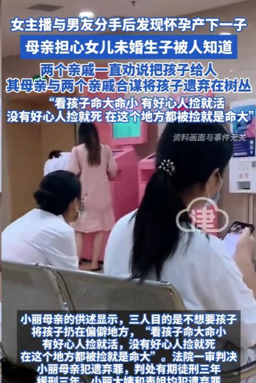 “太坏了!”吉林长春,一女主播与男友分手后发现怀孕,在医院生下一男婴,而其母亲、大姨和表姐担心女子未婚生子被人知道丢人,将孩子遗弃在树丛!几人还直言:看孩子命大命小,有好心人捡就活,没有好心人捡就死!网友:心太狠了! 事情是这样的,这名女子是主播,处了个对象,后来俩人掰了,这时候才发现自己怀了孕,她想把孩子生下来,可孩子他爸联系不上了,没辙只能自己扛着,十月怀胎不容易,最后在医院顺顺利利生下个大胖小子。 本以为是添丁的喜事,没成想家里人却犯了愁,女子的母亲、大姨还有表姐,仨人凑一块儿嘀咕:“姑娘还没结婚就生了娃,传出去多丢人啊,街坊邻居得咋戳脊梁骨?” 母亲表示这孩子不能留,大姨和表姐听了也跟着劝,说送给别人也行,这样最稳妥,可几人想了想,还是决定把孩子扔了。 姑娘刚生完孩子身子虚,听着听着就迷迷糊糊睡着了,等她醒过来,发现孩子没了,急得直哭,赶紧问孩子去哪儿了,母亲这才支支吾吾地说:“我们把孩子抱出去了,放那边施工的树丛里了。” 还好那天有施工的师傅路过,听见树丛里有孩子哭,赶紧过去把孩子抱了出来,送到医院检查,万幸孩子没啥大事,后来这事儿被警察知道了,女子的母亲、大姨和表姐都被抓了。 法院最后判了,其母亲蹲三年大牢,大姨和表姐各蹲一年,网友们看了这事儿,都气不打一处来,有人说:“这哪是当亲人的,心也太狠了,孩子是无辜的啊”,还有人说:“就为了那点面子,差点害了一条小命,值当吗?” 说到底,面子再重要,也没一条人命金贵,为了怕丢人就做出这种事,最后把自己送进了监狱,真是得不偿失。 信息来源:《女主播生下失联前男友的儿子,母亲嫌未婚产子丢人,与亲戚合谋遗弃!法院判了》津云