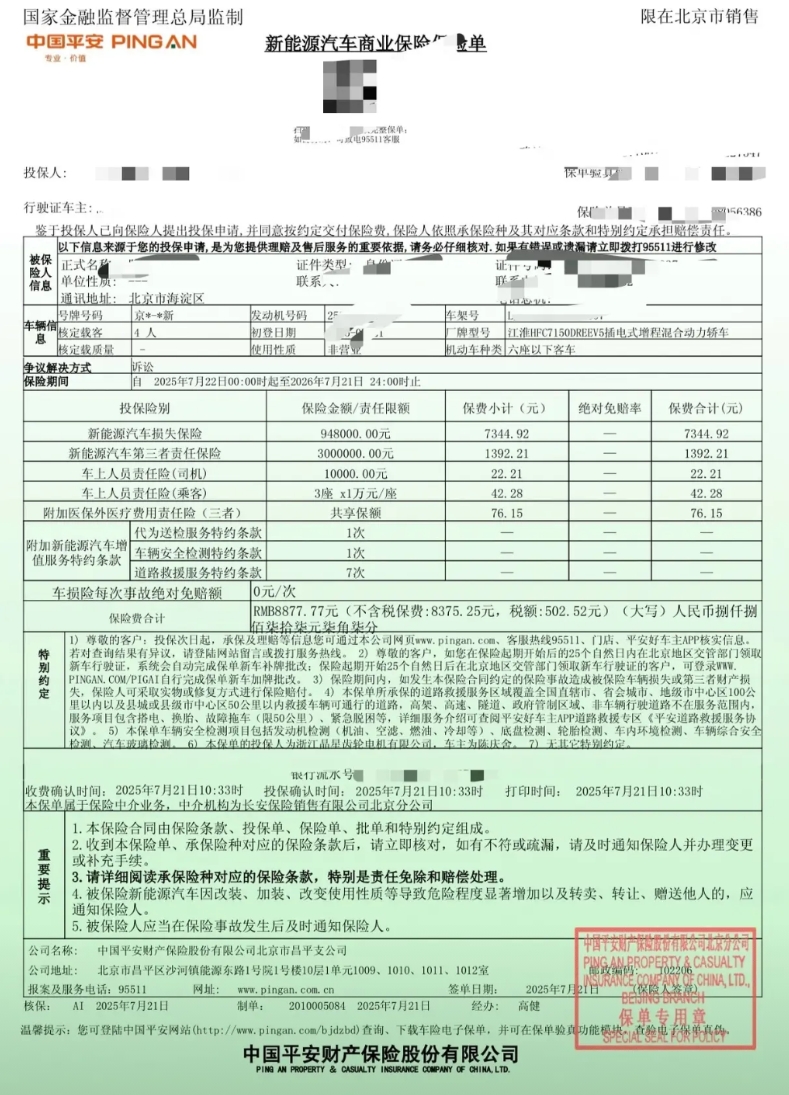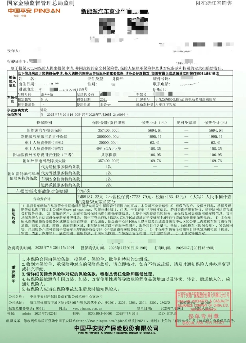 一名博主同时买了小米yu7和尊界s800,两台车买了同一家保险,意外的是小米yu