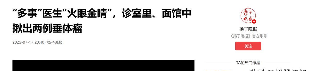 “这名医生火了!”江苏苏州,一女子带着口罩陪母亲到医院就诊,没想到,医生却看出她长了垂体瘤,可女子连脸都没露出来,医生仅凭她的眉骨就察觉异常,眼见女子不相信,医生表示让她去检查一下,如果是正常的话,40元诊断费他报销! 今年 7 月苏州的天气潮乎乎的,附一院的神经外科诊室里挤满了人,张女士戴着口罩陪母亲来看头疼的老毛病。 她自己没挂号就坐在诊室角落的塑料椅上,手机调了静音,想着等母亲看完就赶紧回家做饭,压根没觉得自己身上有啥不对劲。 给母亲看病的是刘医生,五十多岁头发有点白,说话慢悠悠的,他正拿着片子跟母亲说病情,偶尔抬头喝水的功夫,目光扫过角落里的张女士忽然停住了。 张女士那天戴的是那种普通医用口罩,遮得挺严实,就露出额头和眼睛,连眉毛都挡了一半,可刘医生盯着她看了几秒,跟母亲交代了两句注意事项,转头就朝她这边说建议她也做个检查。 这话让张女士愣了一下,她下意识摸了摸口罩,以为自己听错了,自己又没说不舒服,也没挂号,医生咋突然让她检查? 刘医生指了指她的额头,说看着眉骨那块有点不对劲,像是有点往外凸担心脑子里可能长了东西。 张女士心里直犯嘀咕,觉得这也太玄乎了,自己平时没啥感觉不头疼不头晕,连觉都睡得香,戴个口罩就被看出脑子里长东西?怕不是医生想多开检查项目吧,她坐在那儿没动,脸上没表情,心里已经把这事儿归成了不靠谱的建议。 刘医生像是看出了她的犹豫,也没多解释那些医学名词,就说先做个简单的抽血检查,看看激素水平,也就花 40 块钱。 要是查出来啥事儿没有,这 40 块钱他自己给报了,这话一出,张女士倒有点不好意思了,想着 40 块钱也不多,就算白跑一趟,全当给医生个面子就点了头。 抽血结果出来得挺快,护士把单子递过来时,张女士瞅着那几个箭头都往上指,心里咯噔一下,刘医生拿着单子看了看,说还是得做个磁共振再确认下,她这才有点慌跟着去预约了检查。 等磁共振结果出来,报告上明明白白写着 “垂体瘤”。张女士拿着单子站在走廊里,腿都有点软,她这才想起这两年确实感觉鞋码大了半号,手指也比以前粗了点,还以为是年纪大了正常变化,压根没往生病上想。 后来住院做手术主刀的还是刘医生,术前谈话时刘医生笑着说,当时看她眉骨那块的轮廓,跟常见的垂体瘤患者有点像,那种瘤子长得慢,很多人自己都没啥感觉,但骨头会慢慢有变化,只是平时没人特意留意。 同病房的病友听了这事儿,都啧啧称奇,说这医生也太神了,戴个口罩都能看出问题,张女士自己也觉得幸运,要不是刘医生多了句嘴,说不定这瘤子再长几年真要出大问题。 手术挺顺利,出院那,张女士想把那 40 块钱还给刘医生,还想塞个红包都被他推回来了,刘医生说,这都是应该做的,看病嘛本来就该多留意点,万一漏了啥心里不安稳。 这事儿在小区群里传开后,好多人都说现在这样的医生太少了,平时去医院,医生忙得头都不抬,能把挂号的病人看完就不错了,哪会留意陪同的人。 (信息来源:扬子晚报——“多事”医生“火眼金睛”,诊室里、面馆中揪出两例垂体瘤)
