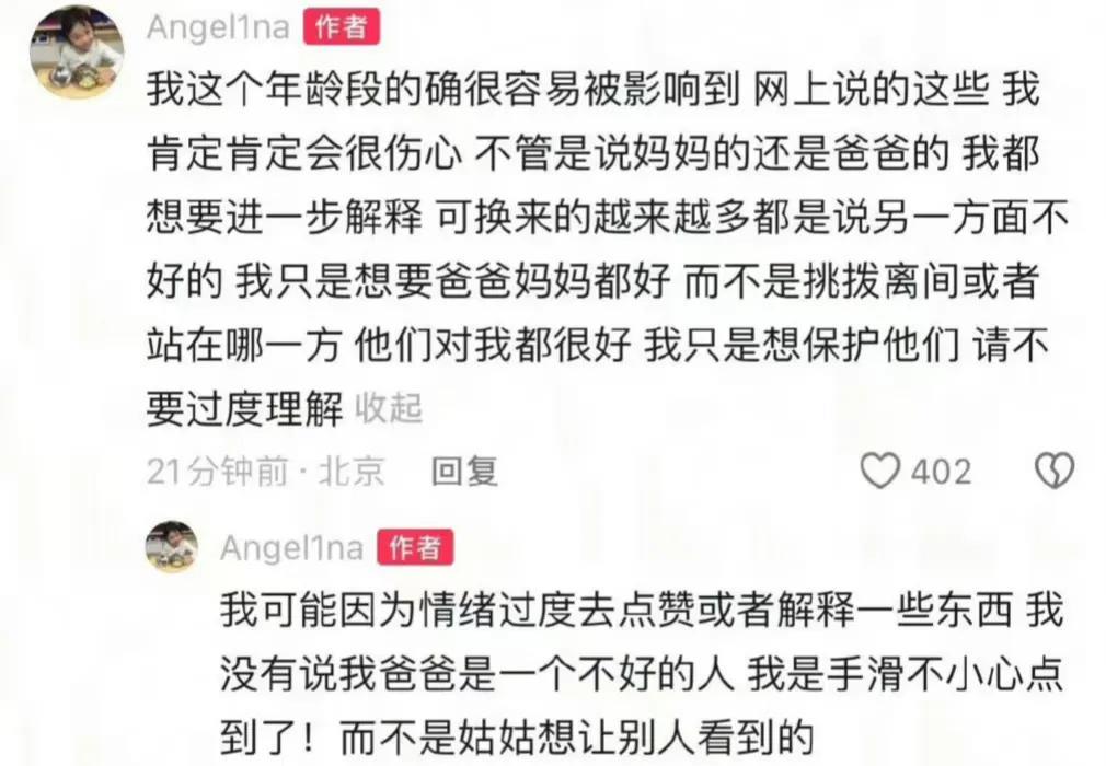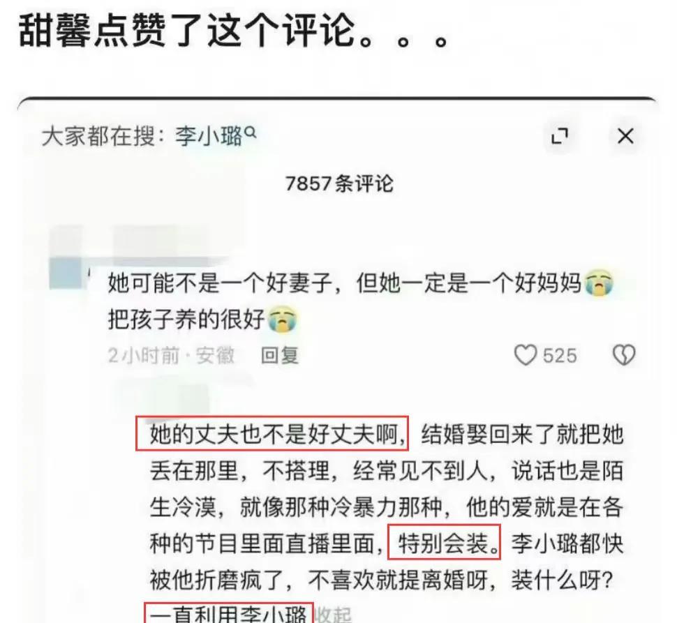 甜馨又上热搜了 这次不是因为爸爸贾乃亮,也不是因为妈妈李小璐,而是因为她自己。 甜馨发了一张和妈妈的照片,并且配文:“妈妈的爱比闲言碎语先到”,网友们纷纷在底下评论,而其中有一条是说爸爸贾乃亮不好之类的话,没想到甜馨竟然点赞了。 这一举动引起网友们热议,觉得甜馨肯定是心里对爸爸有想法,有委屈,才会去点赞,认同。 贾乃亮和李小璐当年离婚虽然说共同照顾女儿,但是甜馨一直是李小璐带在身边照顾的。 老话说:孩子谁带就跟谁亲。 所以现在甜馨一直在网络上维护自己的妈妈,再正常不过了。 如果说甜馨不维护自己妈妈,那才是有问题呢?你说是不是?#甜馨# #贾乃亮# #李小璐#