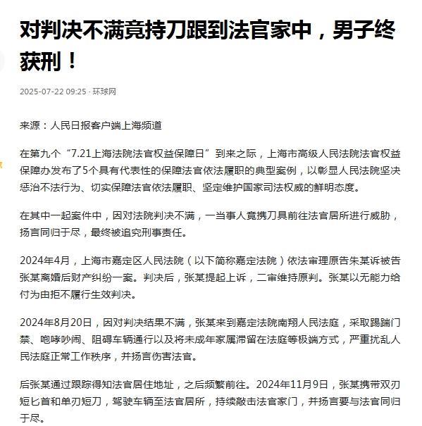 上海嘉定,一男子因不满离婚财产分割判决,将怨恨对准了主审法官。事发前三个月,男子大闹法庭,踢门咆哮、拦车,滞留未成年家属在法庭,还扬言要教训法官,被拘留五天。男子出来后,悄悄跟踪法官下班,摸清了住址,揣着双刃匕首和单刃短刀,开车直扑主审法官家门口。他死命捶门,隔着门缝嘶吼要与法官同归于尽。报警后,警方火速赶到将其制服,搜出凶器。男子因持凶器上门恐吓法官,被认定情节极其恶劣,以寻衅滋事罪判刑八个月。 据悉,张某(化名)与前妻朱某(化名)协议离婚,协议约定房产归张某所有,而其向前妻支付房屋折价款45万元。 协议达成后,张某与前妻领了离婚证,但其并未按照协议约定向前妻支付折价款。前妻一气之下,将张某起诉到法院。 一审法院认定双方达成的离婚协议中财产分割内容合法有效,遂判决张某按照协议约定向前妻支付折价款。 张某不服,遂提起上诉。二审法院审理后,认为一审判决并无不当,遂维持原判决。 在判决生效后,张某继续以没有支付能力为由,拒绝履行生效判决。 2024年8月20日,张某的愤怒首次公开爆发,他冲进南翔法庭,像一头失控的困兽,疯狂踢踹门禁,在走廊里咆哮怒吼,甚至试图阻拦进出法庭的车辆。更令人揪心的是,他将年幼的家属独自留在法庭角落,自己则高声叫嚣着“让法官出来!”、“我要他好看!”等威胁性言语,法庭秩序瞬间陷入混乱。 法庭当即启动应急预案,增派法警到场稳控。面对劝阻,张某充耳不闻。公安机关介入后,因其行为严重扰乱法庭秩序,依法对其处以行政拘留五日的处罚。 然而,惩戒并未熄灭张某心中的怒火,反而如添了一把干柴。被释放后,他并未反思,而是将矛头彻底指向了主审法官。他开始在法庭外蹲守,悄悄尾随法官下班,经过数日的秘密跟踪,竟成功摸清了法官的家庭住址。 2024年11月9日,一个普通的周末傍晚,危险骤然降临。张某驾车抵达法官所居住的小区。他怀中揣着一把令人胆寒的双刃短匕首,口袋里还藏着一把单刃短刀。他径直上楼,站在法官家门前,开始持续、用力地敲击房门,声音在安静的楼道里显得格外刺耳。 当门内传来询问声时,张某隔着门厉声吼道:“你给我出来!今天不是你死,就是我亡!我们同归于尽!”门内的法官惊骇万分,立即反锁房门并报警。 警方介入后,对张某采取了强制措施,并依法对其立案侦查,经由检察院审查后,对张某以寻衅滋事罪提起公诉。 那么,法院会如何判决呢? 《刑法》第二百九十三条第一款规定:“有下列寻衅滋事行为之一,破坏社会秩序的,处五年以下有期徒刑、拘役或者管制:...(二)追逐、拦截、辱骂、恐吓他人,情节恶劣的;...” 结合相关司法解释,多次追逐、拦截、辱骂、恐吓他人,造成恶劣社会影响的;或持凶器追逐、拦截、辱骂、恐吓他人的,均属于情节恶劣情形。 本案中,张某并非空手前往,而是携带了双刃短匕首和单刃短刀,这两件物品在法律上属于管制刀具,具有极强的攻击性和杀伤力。 张某携带凶器本身,就使其口头上的“同归于尽”威胁具备了转化为现实暴力的高度可能性。这远非一般的口头谩骂或虚张声势,而是将抽象的威胁具象化为随时可实施的致命行动,对被害人造成了巨大的、难以摆脱的心理强制和现实恐惧。 张某持续用力敲击法官家门,在相对封闭、私密的住宅楼道内厉声吼叫“同归于尽”,这种行为本身就带有强烈的攻击性和侵入性,营造了一种孤立无援、无处可逃的恐怖氛围,对门内的法官及其家人形成了直接、即时的心理压迫。 而且,张某针对的是依法履职的法官,身份特殊,他并非张某的私人仇敌,而是代表作出裁判的司法人员。张某的行为,直接源于对法官依法作出的生效判决的不满和报复。 张某的目的并非解决私人恩怨,而是意图通过暴力威胁迫使司法人员屈服,否定生效裁判的效力。如果容忍这种行为,将严重动摇公众对司法公正和安全性的信心。 期间,张某通过非法跟踪获取并闯入这一空间实施威胁,这不仅仅是恐吓个人,更是侵害了司法工作者应享有的基本生活安宁和安全屏障。这极大地损害了整个法官群体的职业安全感和尊严感。 从案件发展脉络看,张某的行为具有明显的递进性和预谋性,先因扰乱法庭秩序被行政拘留,但 不思悔改,继续非法跟踪获取法官住址,准备凶器,上门实施具体恐吓行为。这一系列行为表明其主观恶意极深,报复意志坚决,绝非一时情绪失控的偶然行为。 最终,法院认定张某的行为已经构成寻衅滋事罪,判处有期徒刑八个月。 对此,大家怎么看?#头号创作者激励计划#