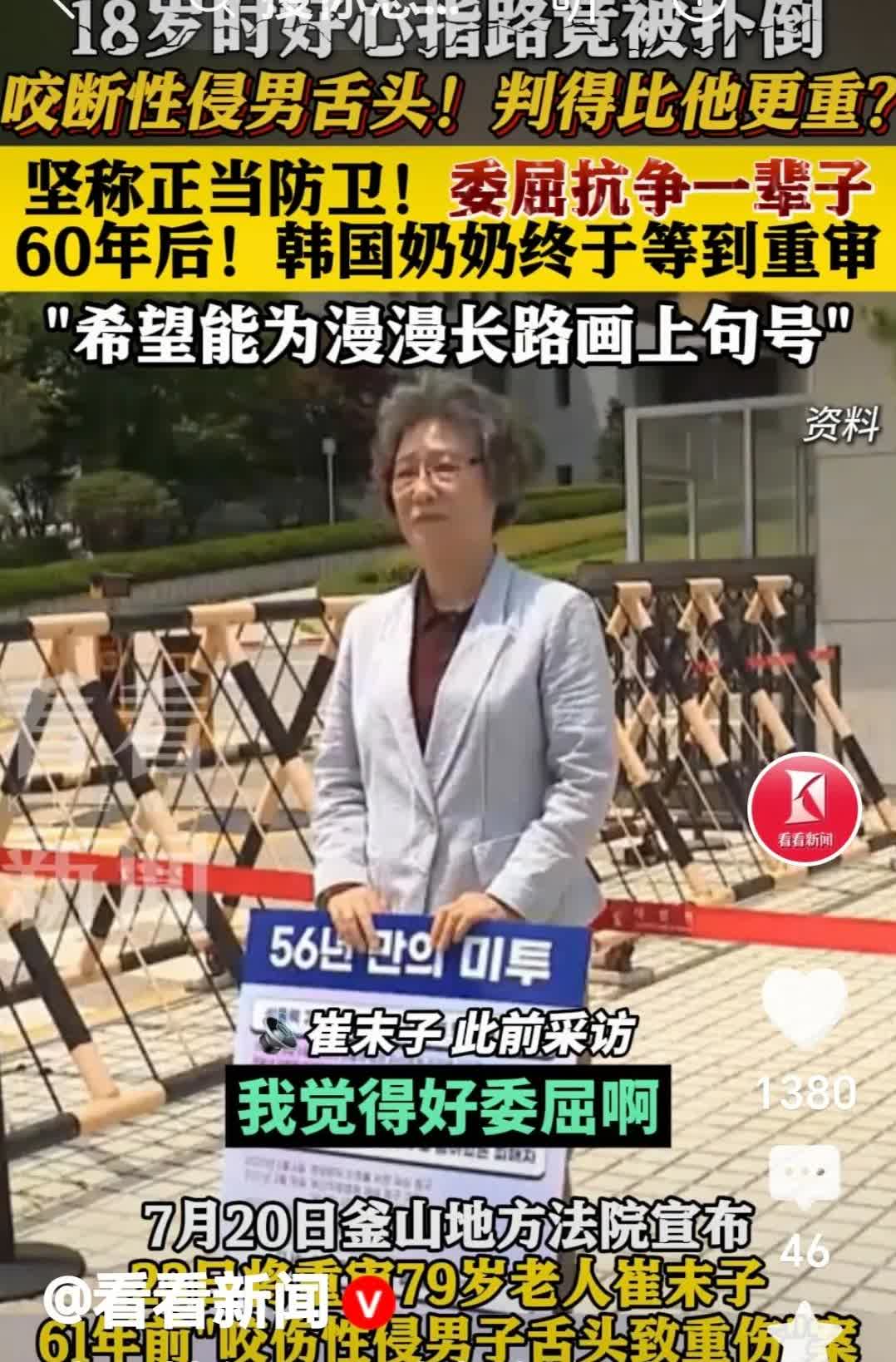 韩国老奶奶经过一辈子的抗争,终于得到釜山法院的重审。 79岁老奶奶崔末子在18岁时给人指路,招到性侵咬断对方舌头👅,最后被判刑比性侵男还重,老奶奶不服,坚持是正当防卫,一生都在抗争中,希望法院的重审给漫漫长路划上句号。