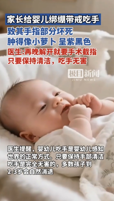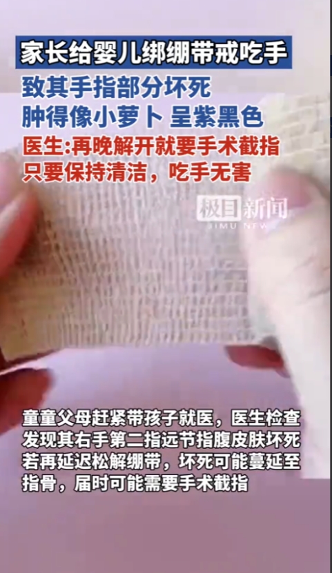 信息来源:《家长给婴儿绑绷带戒吃手,致其手指部分坏死,肿得像小萝卜,呈紫黑色,医生:再晚解开就要手术截指,只要保持清洁,吃手无害》极目新闻