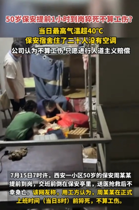 信息来源:《50岁保安提前1小时到岗猝死不算工伤?家属:当日最高气温超40℃,保安亭和宿舍没空调》海报新闻