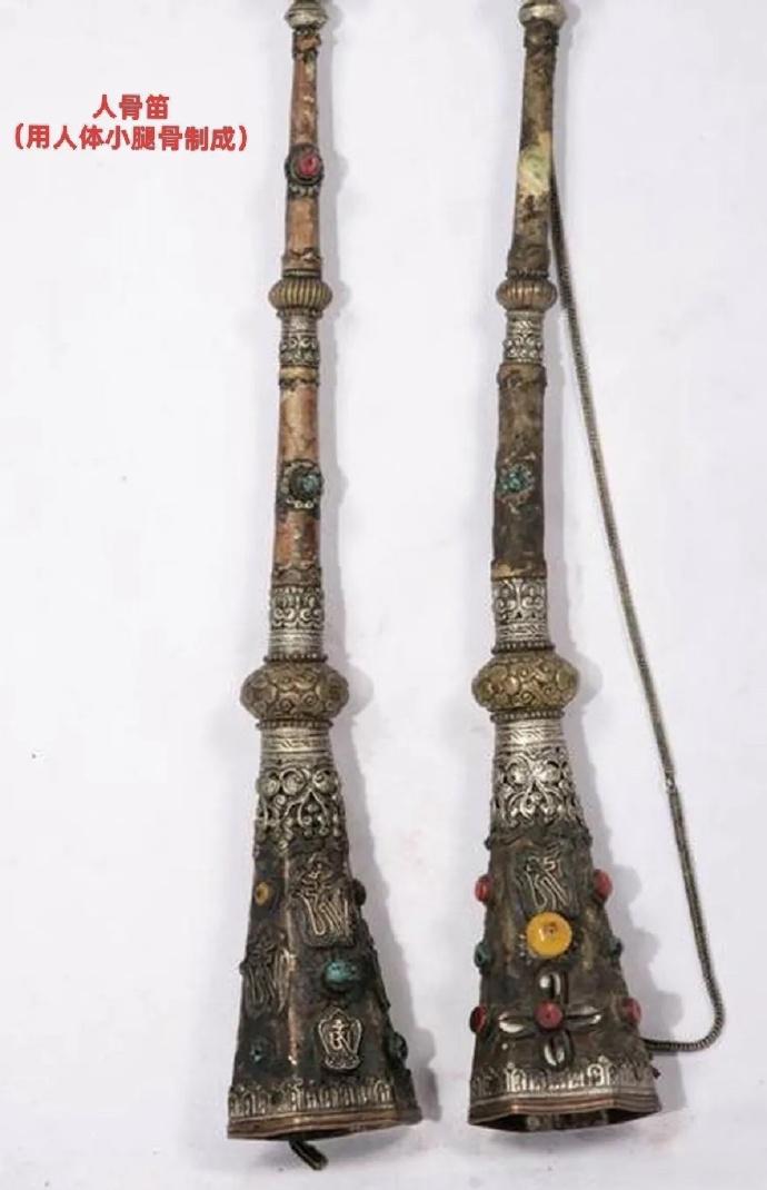 这是旧社会西藏农奴主用以祈祷祭神的“法号“,竟是用活人的大腿骨制成的,还有这种“人骨笛”,是用人的小腿骨做成,有些还包镶金银饰品,吹奏起来声音既尖锐又刺耳,听起来让人有窒息般的恐惧感,再加上其制材来源,更是令人不寒而栗……