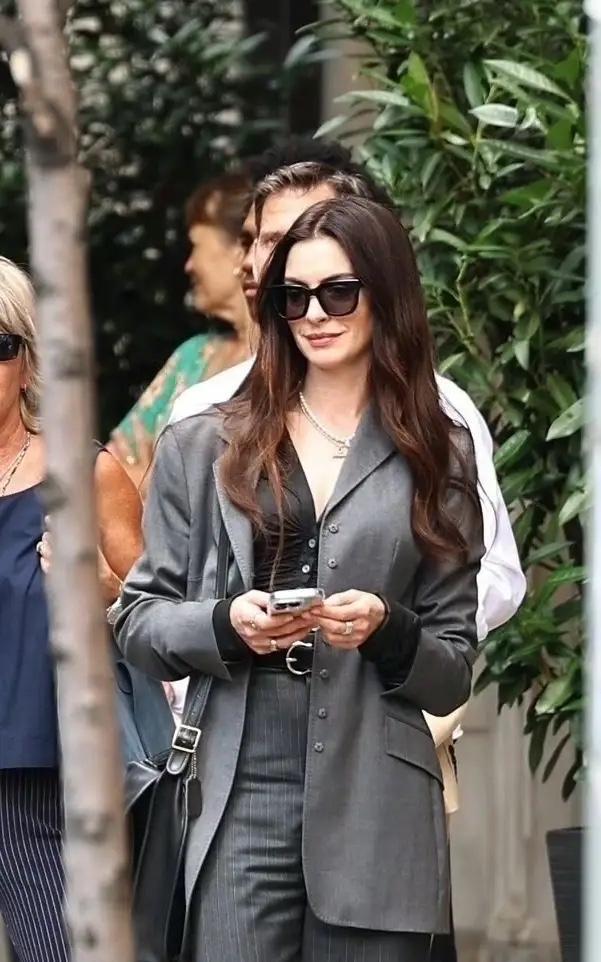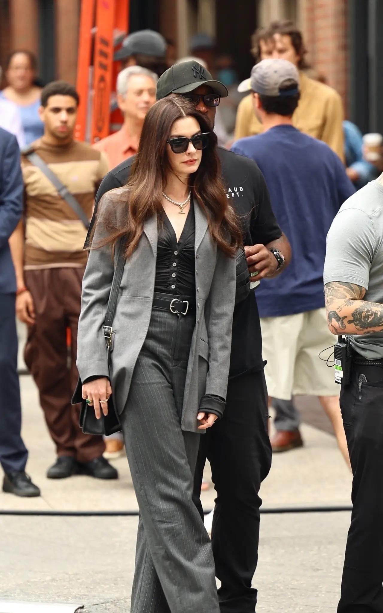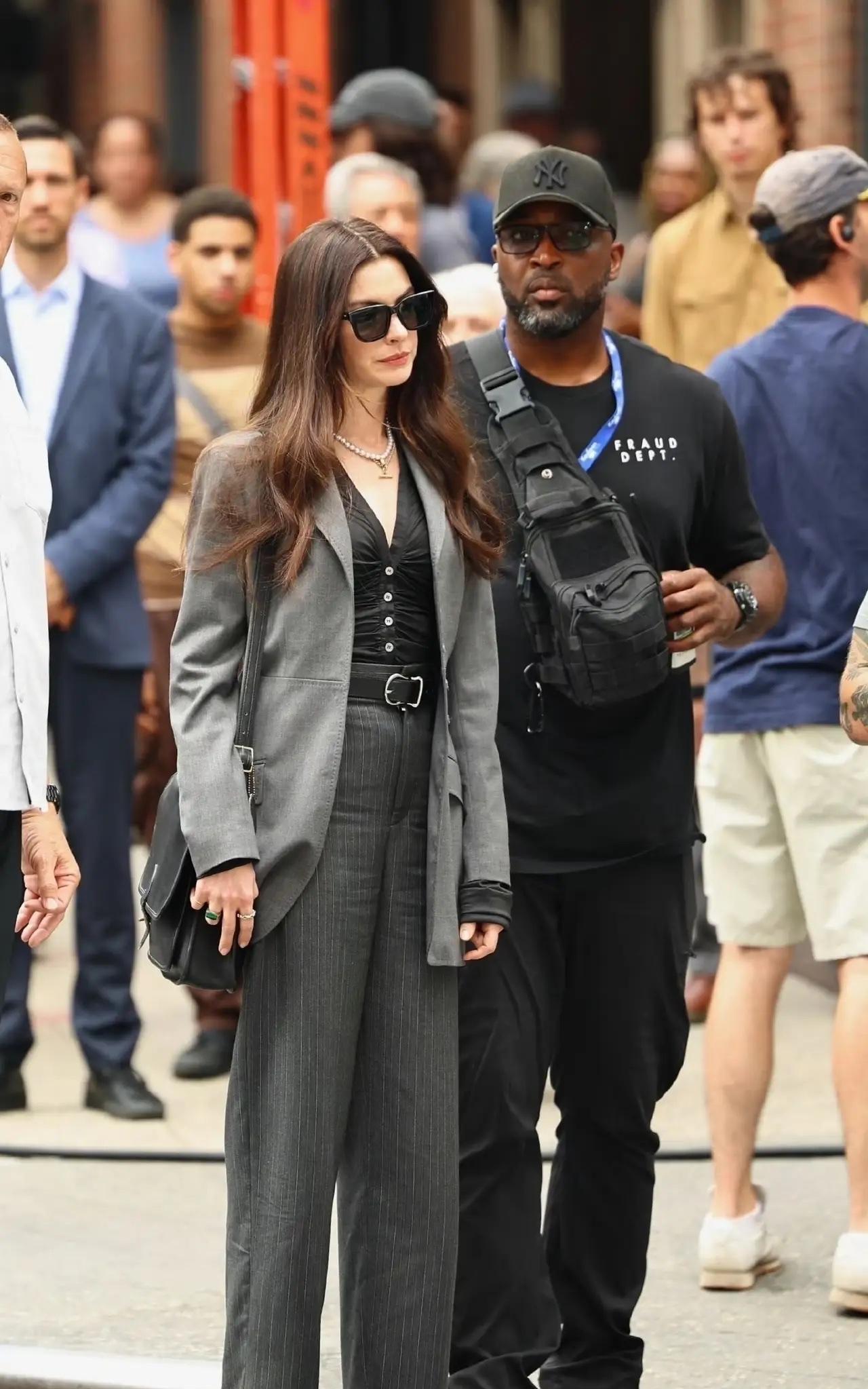 安妮·海瑟薇最新纽约拍摄《穿普拉达的女王》第二部片场美照~ 背着大包、踩着高
