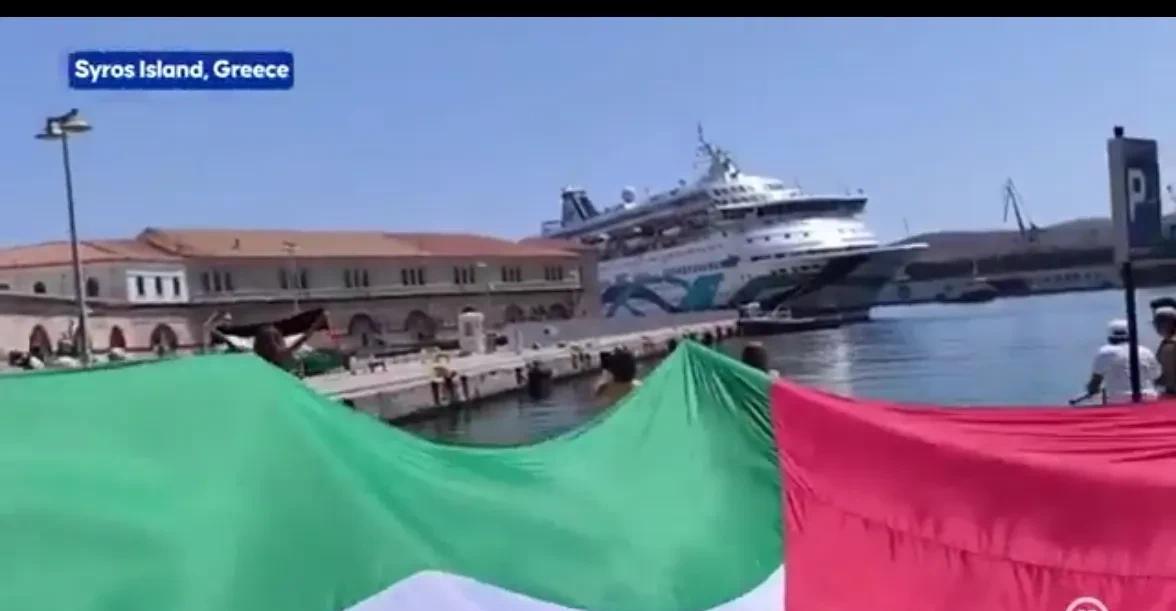 谁家的船啊,跑这么快?昨日一豪华游轮驶近希腊著名旅游景点西罗斯岛,在准备靠岸时突然慌忙决定改道塞浦路斯。 啊原来是以色列的游轮,啊原来是看到了岛上拉着牌子准备【好好迎接】他们的希腊岛民。 船上共1600名以色列游客。码头是涌入了300多名“热情”打着巴勒斯坦旗帜的希腊岛民。游轮立刻决定跑路,逃之夭夭。