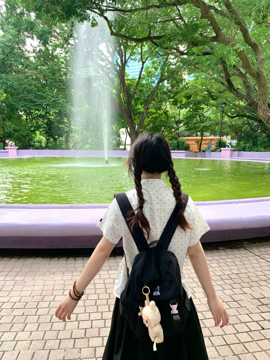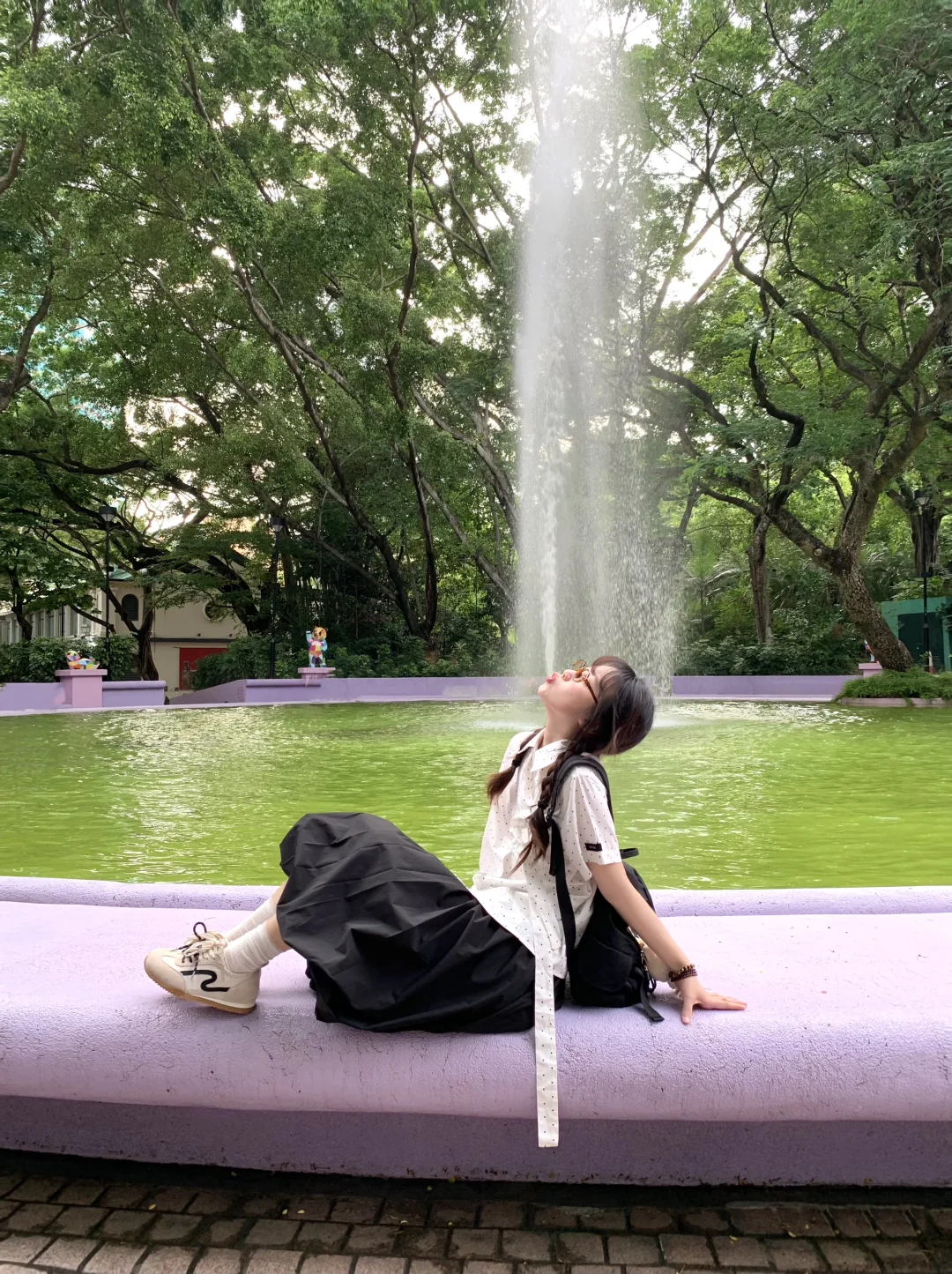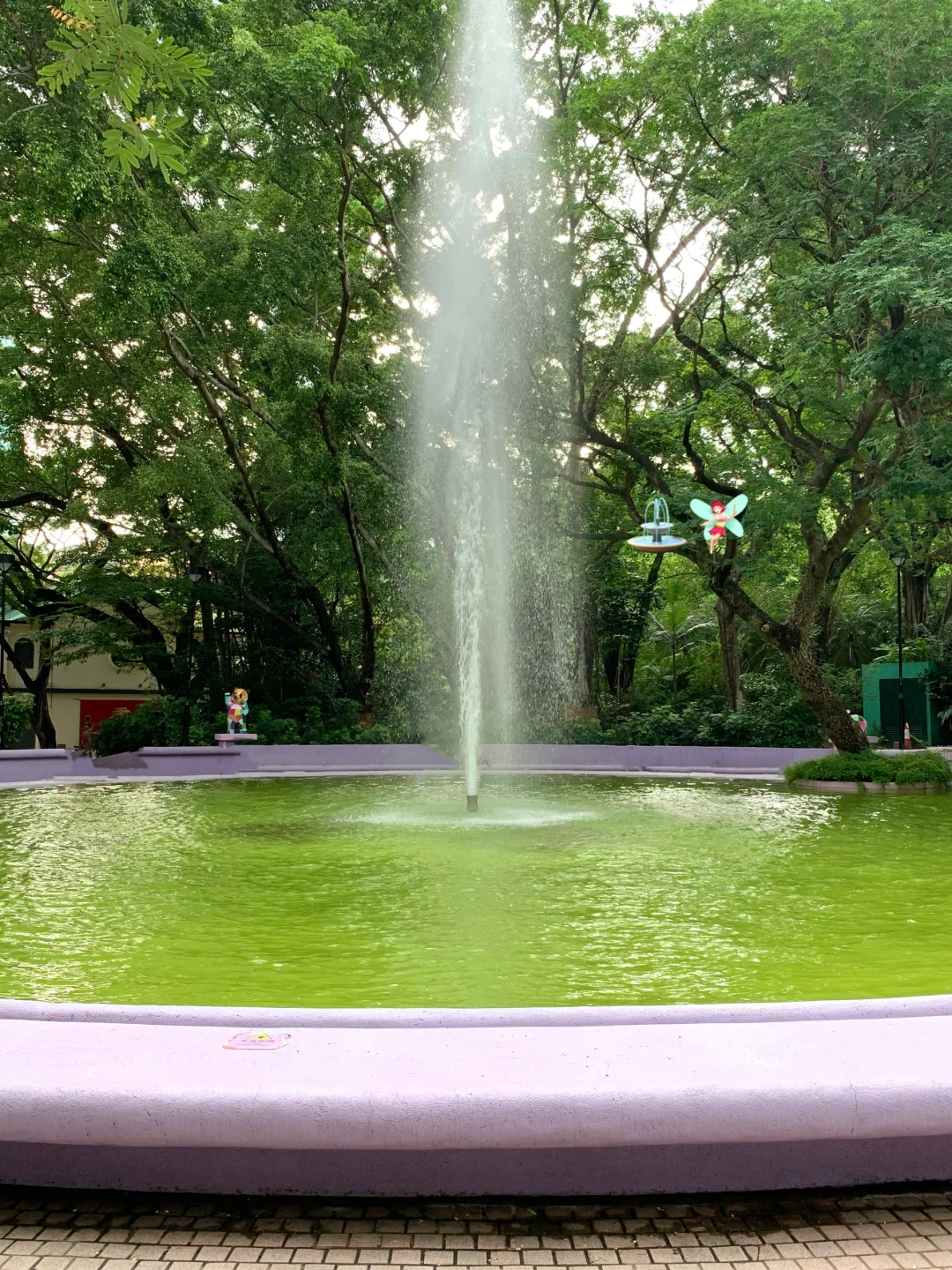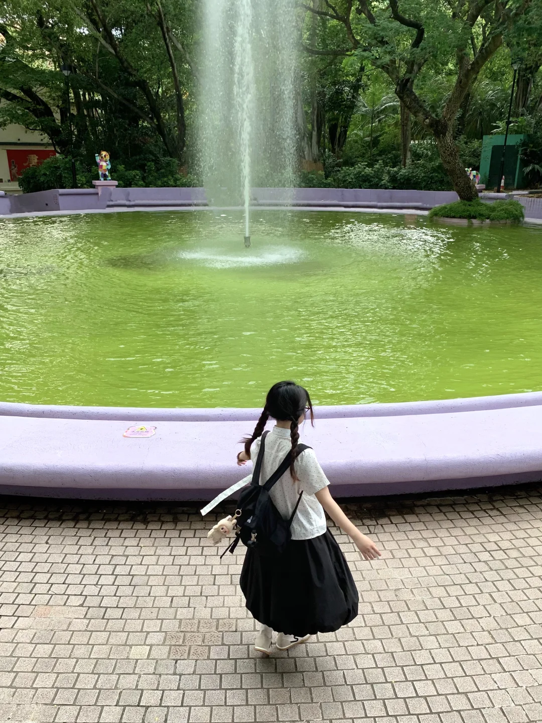 在香港九龙公园逛逛~ 请问我的清澈喷泉和阳光呢? 不过紫色真的好梦幻 安慰自己是限定版的抹茶绿喷泉哈哈哈 最近偏爱复古波点🥸喜欢彩色的香港!!!