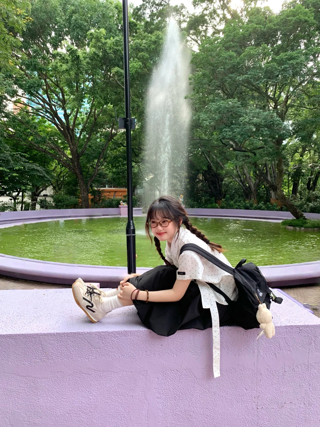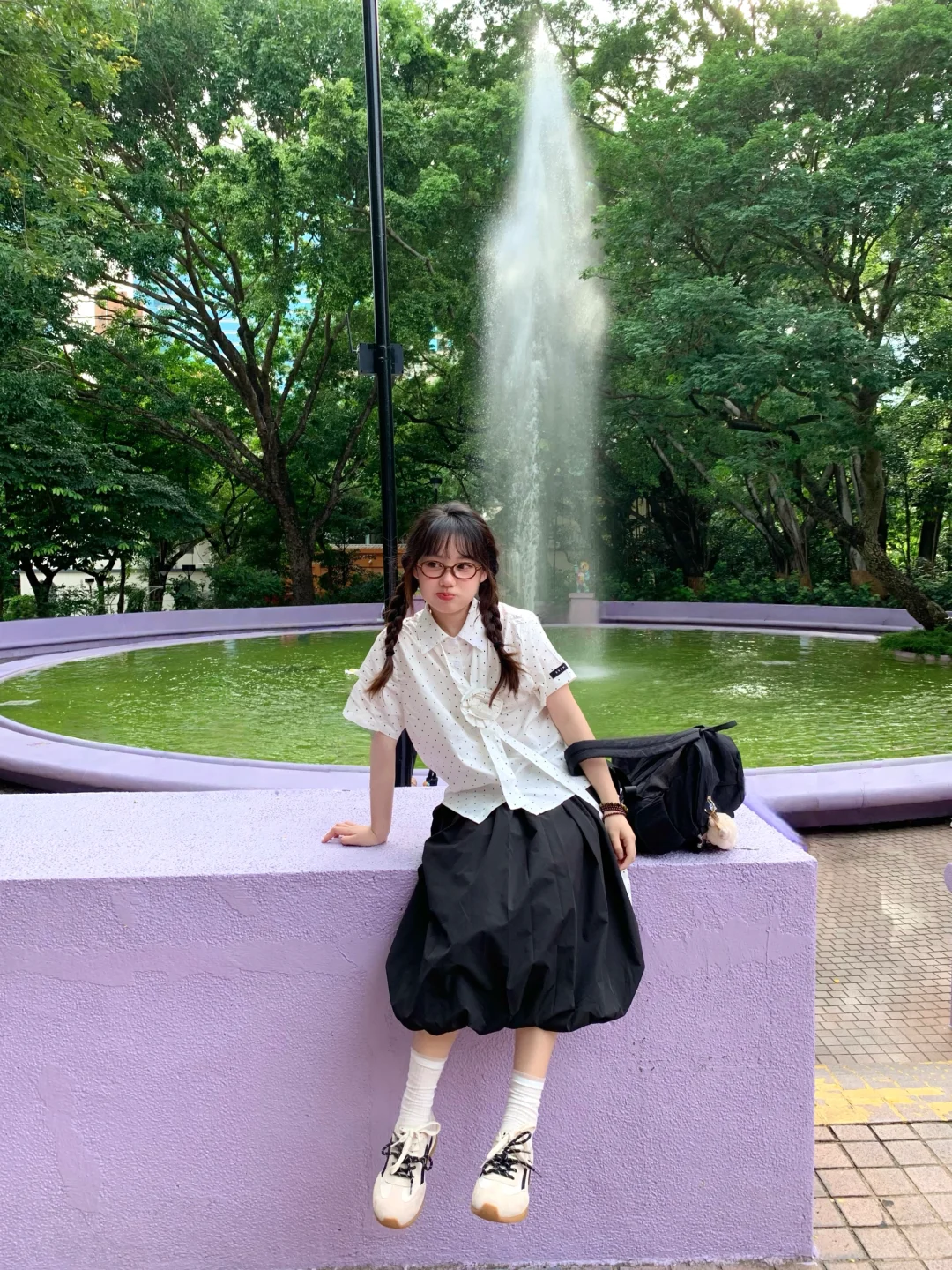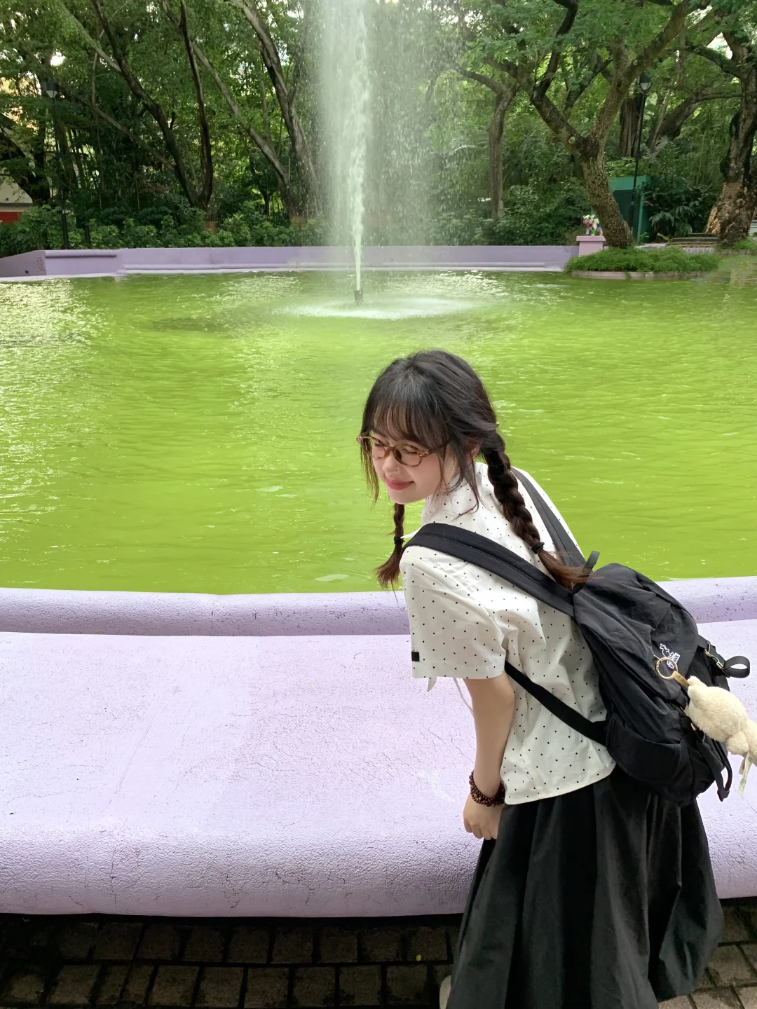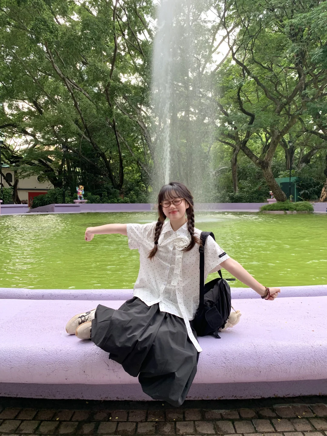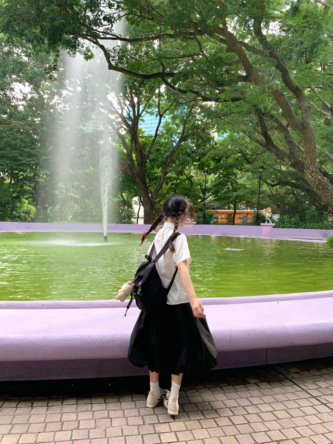 在香港九龙公园逛逛~ 请问我的清澈喷泉和阳光呢? 不过紫色真的好梦幻 安慰自己是限定版的抹茶绿喷泉哈哈哈 最近偏爱复古波点🥸喜欢彩色的香港!!!