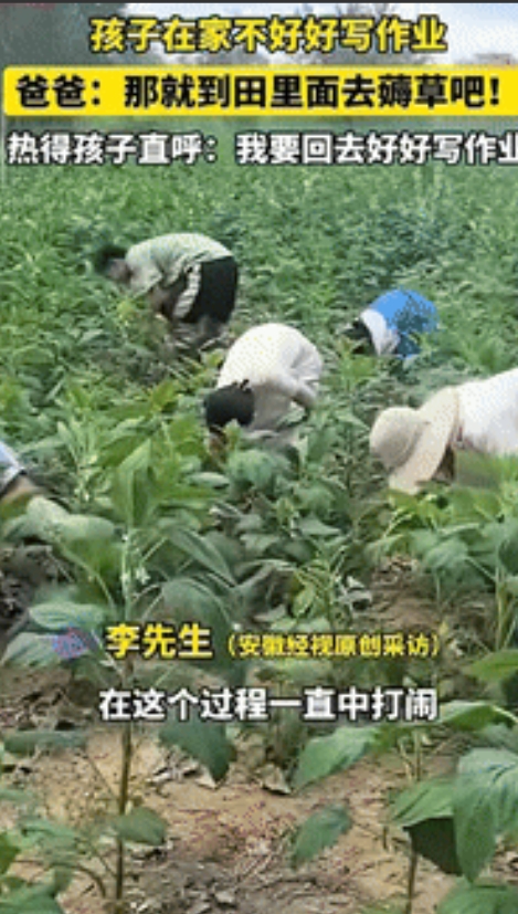 “这下后悔了吧!”安徽阜阳,一男子因孩子在家不好好写作业,将其带到田里薅草,不料,孩子们没待多久就受不了,热的直呼要回去写作业,可男子却没放他们回去,并告诉他们:吃不了学习上的苦,就要吃生活上的苦!