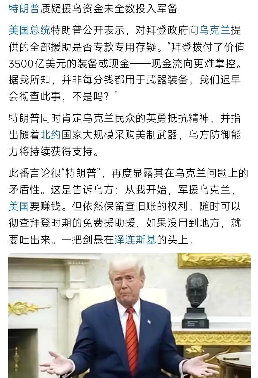 特朗普公然质疑美援乌款项的去向,潜台词是打算查违账,很多钱可能被乌官僚体系贪墨。