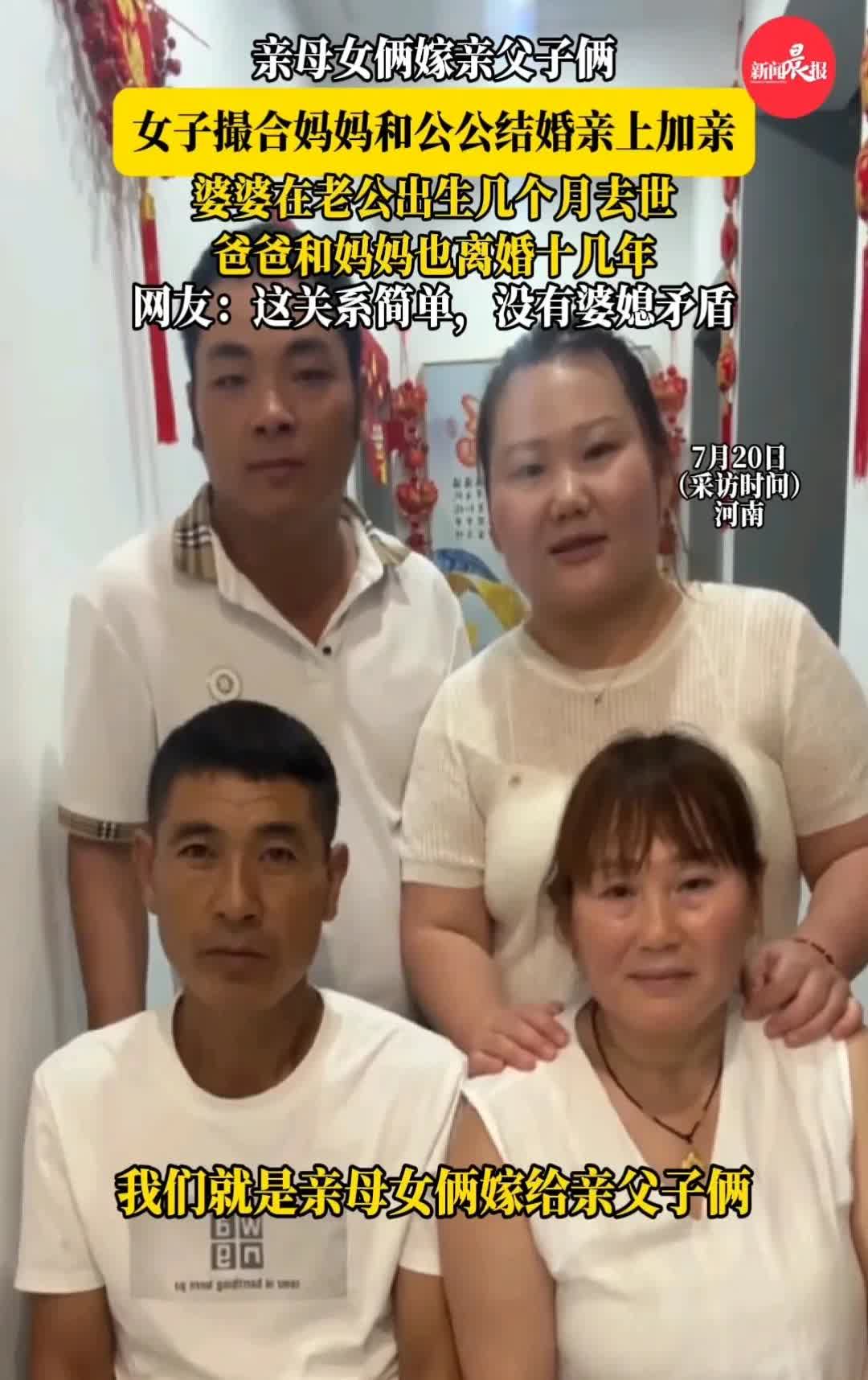 母女俩嫁给了父子俩,女儿撮合妈妈嫁给自己的公公,亲上加亲。两家人过成了真正的一家人,这样的一家,不会出现难相处的婆媳关系,也不会有后爸后妈的困境。 只因女子的婆婆在丈夫出生没多久就去世了,公公一直没有结婚,自己的妈妈和爸爸也离婚多年,女子感觉自己的公公人很好,也想给自己的妈妈找个伴。 感觉家人很合适,就让两人相处,结果两人都感觉不错,这样的一家人很和谐。 对这样的关系怎么看?