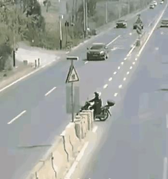 怎么也想不明白,这台轿车为什么会翻车呢?对这个骑摩托车的人来说,不翻车也许没啥大