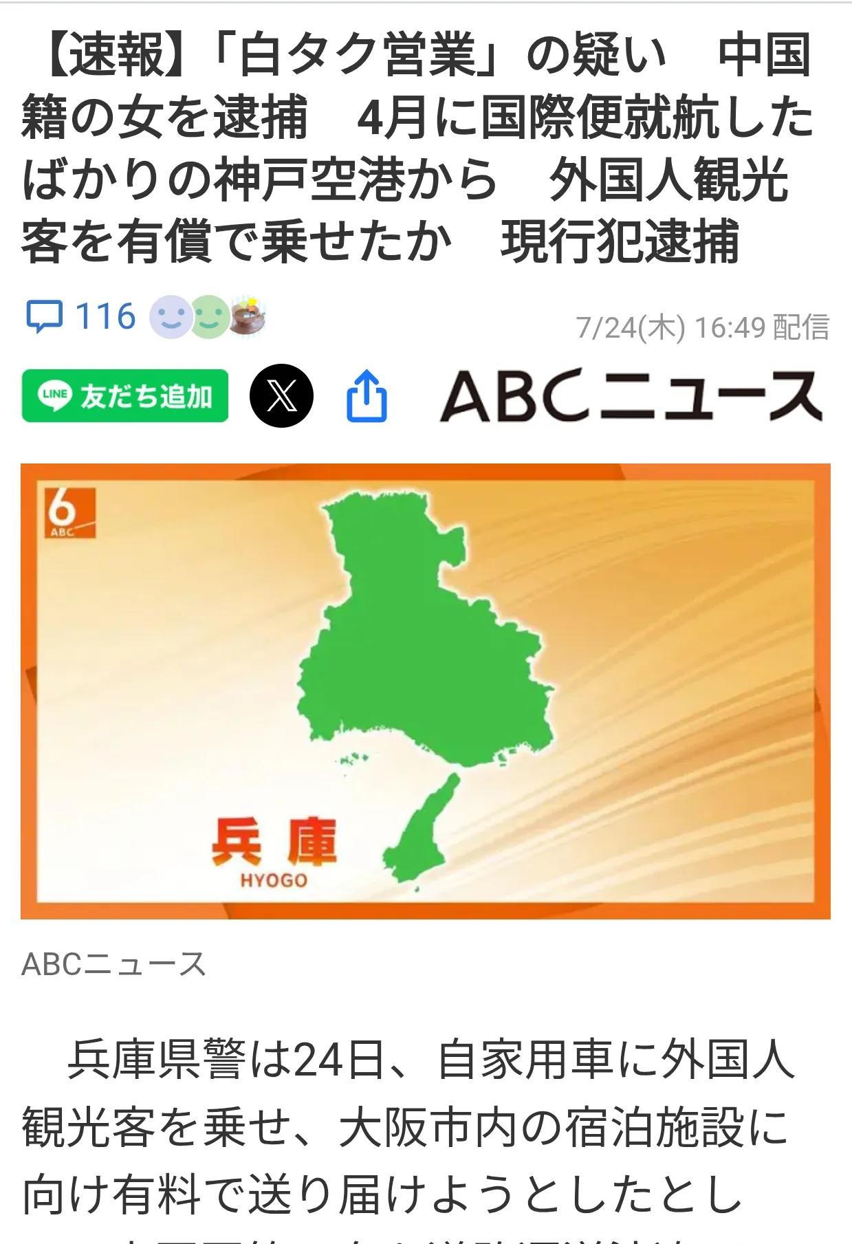 同胞们注意!日警方又逮捕一中国籍司机 日媒报道:7月24日,兵库县警方逮捕了一名涉嫌违反道路运输法的中国籍女子,她将一名外国游客用私家车有偿送往大阪市的酒店。 被捕的是居住在大阪市生野区的一名中国籍女子(30岁)。 警方称,这名女子于7月24日下午1点后,在神户机场附近的街道上,与三名游客约定以550元人民币的价格,前往大阪市的一家酒店。 警方在游客上车并行驶了约2公里左右时拦截并逮捕了这名女子。