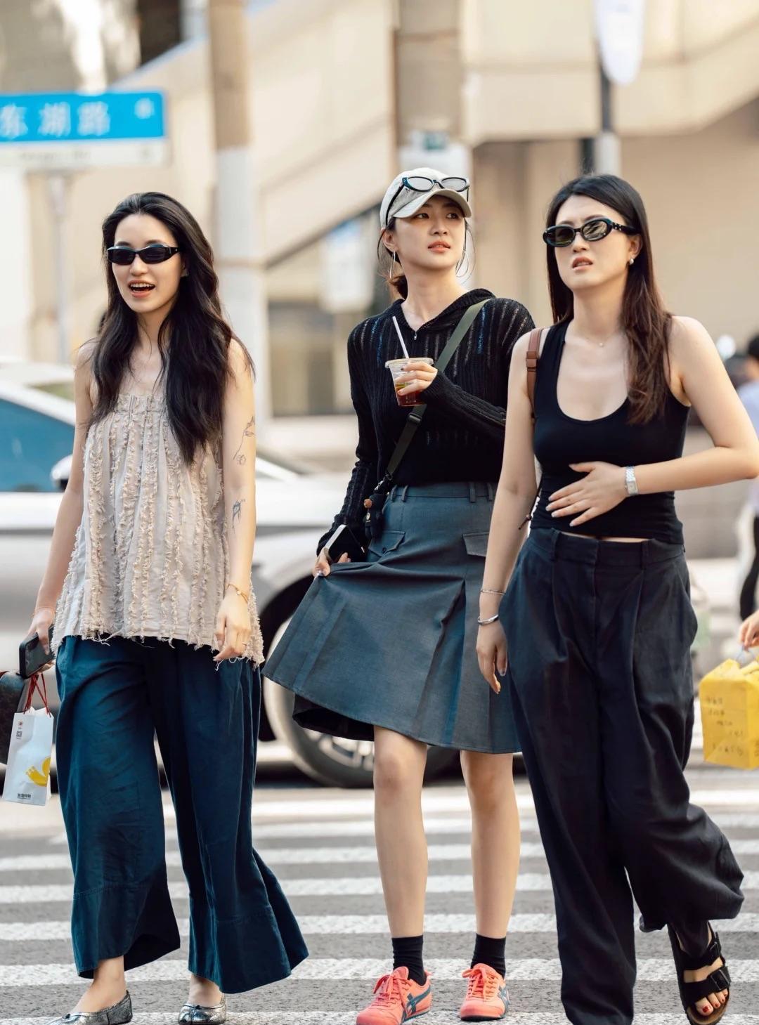 上海街头路人穿搭,清凉又时髦!炎热的夏天很多姐妹都把无袖背心穿在身上,可以搭配一