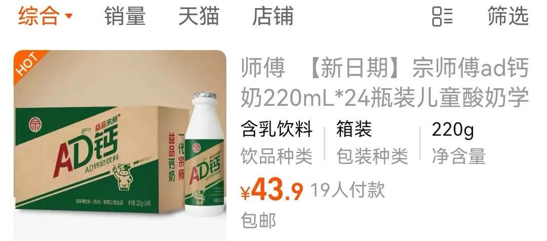 宗泽后的“宗师傅”AD钙奶在淘宝每箱24瓶卖43.9元,娃哈哈的AD钙奶也是每箱