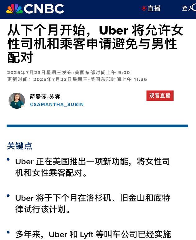 笑死,在男女对立方面,美国竟然开始学习中国经验了,这方面居然是中国领先了!? 据CNBC新闻报道,为了应对美国日益分裂的性别问题,优步(Uber)“女司机女乘客互选”功能(女乘客可以“只”匹配到女网约车司机)。看到这个新闻,我立马就想起,前段时间,滴滴也推出了“女乘客可选女司机”功能,原来在解决男女对立问题方面,咱们有时候也走在了世界前面啊[捂脸]。不过,滴滴推出这个功能后,网上突然出现很多女司机被事逼女乘客搞的苦不堪言,疯狂吐槽事逼女乘客的各种视频。不知道老美那边推出这类功能后,会不会也出现类似情况?[看]