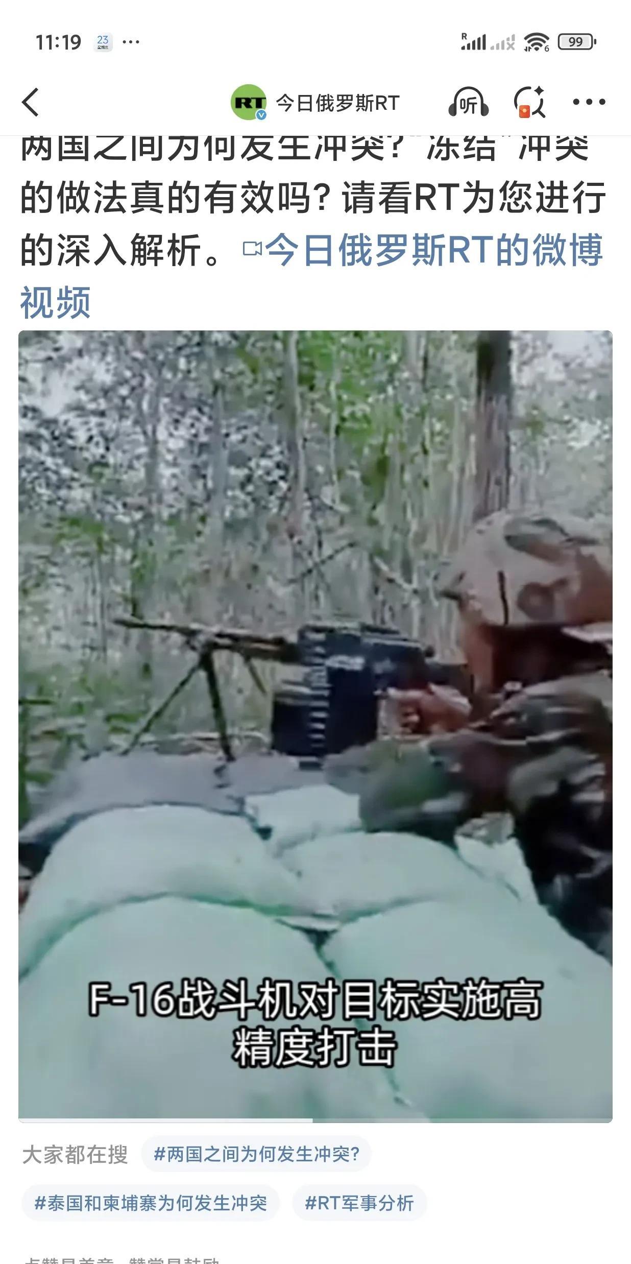泰国和柬埔寨边境领土争议升级,双方爆发建交以来最大规模武装冲突。冲突的起因还是领土争议,加之两国最近龃龉不断,矛盾激化。 领土问题此前被“冻结”,但泰国拒绝接受联合国国际法院就柏威夏寺及周围领土归属问题作出的裁决,并宣布动用F-16战斗机对目标实施打击。 柏威夏寺建于10世纪高棉帝国时期,矗立在柬埔寨与泰国边境的525米高悬崖上。 2008年,柏威夏寺被列为世界文化遗产,争议再度激化。泰国认为此举变相确认柬埔寨对周边4.6平方公里土地的主权。 双方多次爆发武装冲突。也一直延续至今。 泰国军方通报,称泰国陆军第二军区“对柬埔寨进行了陆空联合打击”,在乌汶府使用F-16战斗机对柬埔寨军事目标进行了空袭。摧毁了2辆柬军坦克;重新夺回争议地区的控制权。 泰国外交部今天(7月24日)发表声明,强烈谴责柬埔寨“侵犯泰国国家主权和违反国际法的行为”。 柬埔寨外长紧急赶往纽约联合国总部,呼吁联合国干预泰国对柬埔寨的军事行动。 从两国军事实力看,泰国有明显优势,拥有F16,具备空战能力。而柬埔寨空中力量基本指望不上,就十几架米格21,且防御系统拦截面很小。但陆军战斗力明显优于泰军,他们擅长山地林地作战,且作战勇敢,战斗力强。 两国军事各有优劣,真正打起来,一时也难以决出胜负。