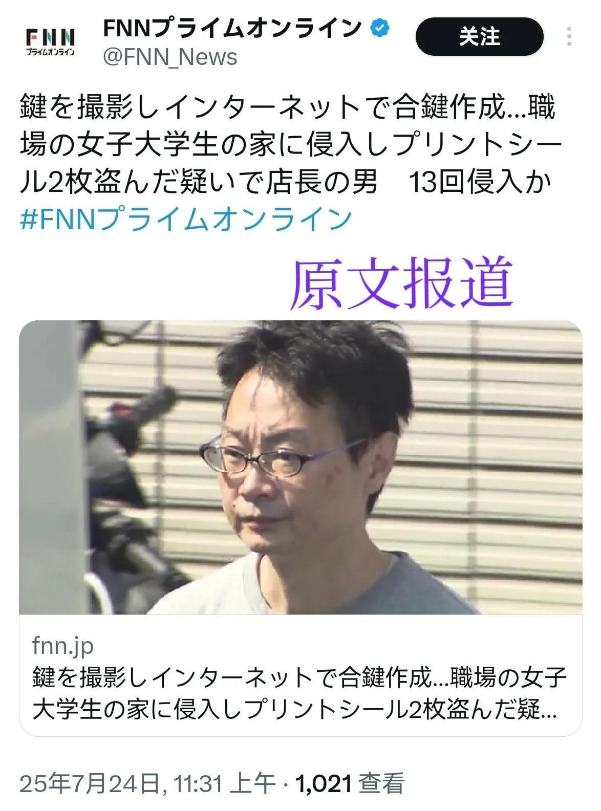 这位日本妹纸或许要庆幸51岁大叔的爱好是摩擦照片而不是本人,大叔只是入室顺走她的一堆相片。 两人在同一间商店工作,大叔是店经理,悄悄拍下女大学生放在储物柜中的钥匙,网上下单复刻一把。大叔只承认进入对方家中13次,拿了两张照片“而已”。 13次进去到底做了什么,这就无人知晓了。日本毕竟是【高信任度】社会,想进谁家?请拍下对方家门钥匙,网上下单即可!